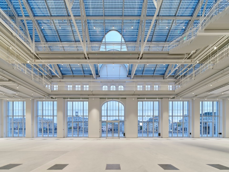 Renzo Piano, together with his collaborators, has created a space accessible to all, where it is possible to meet and enjoy culture together, thanks to an auditorium (which becomes a cinema, a theater, a concert and a conference hall), to the exhibition galleries, to the library, to the archive, to the didactic area and to those space dedicated to artistic residences – lodgings and ateliers for collective work. The project aims to recall a modern glass cathedral and its rooms are flooded with light, which also stands out thanks to the predominant white of the interiors. Furthermore, a birch forest has been created on an artificial hill, with over 600 trees and 80,000 bushes.