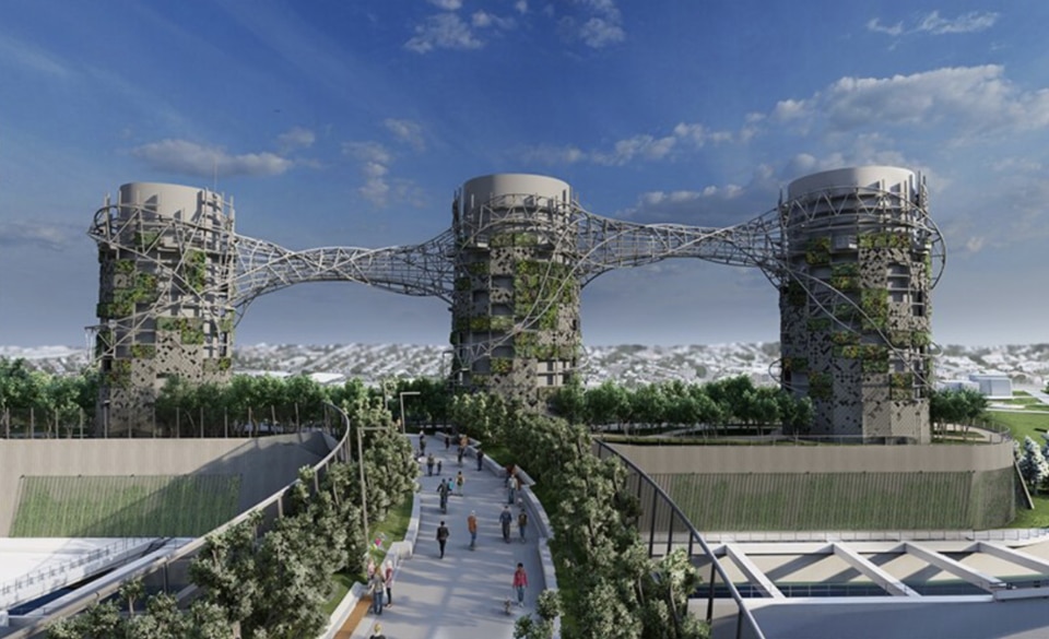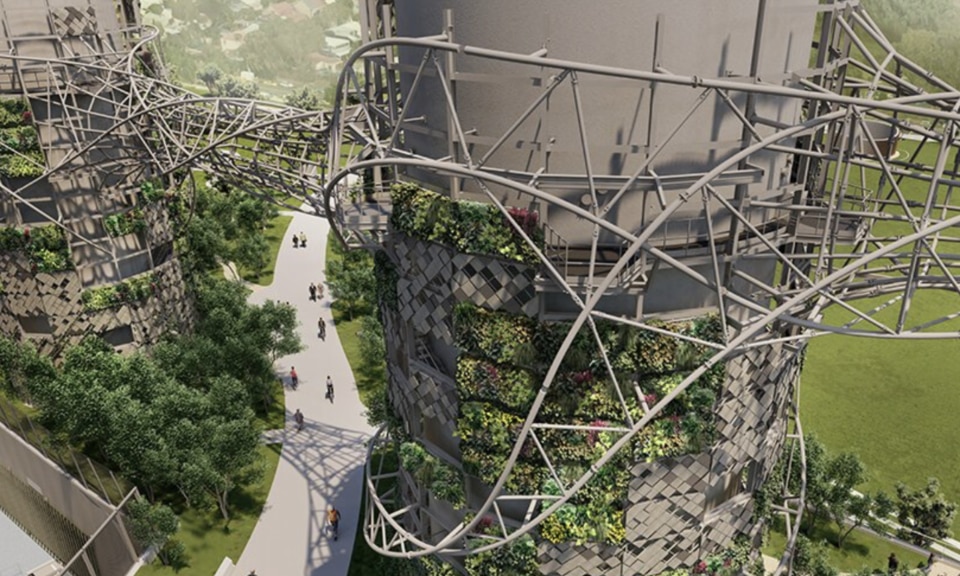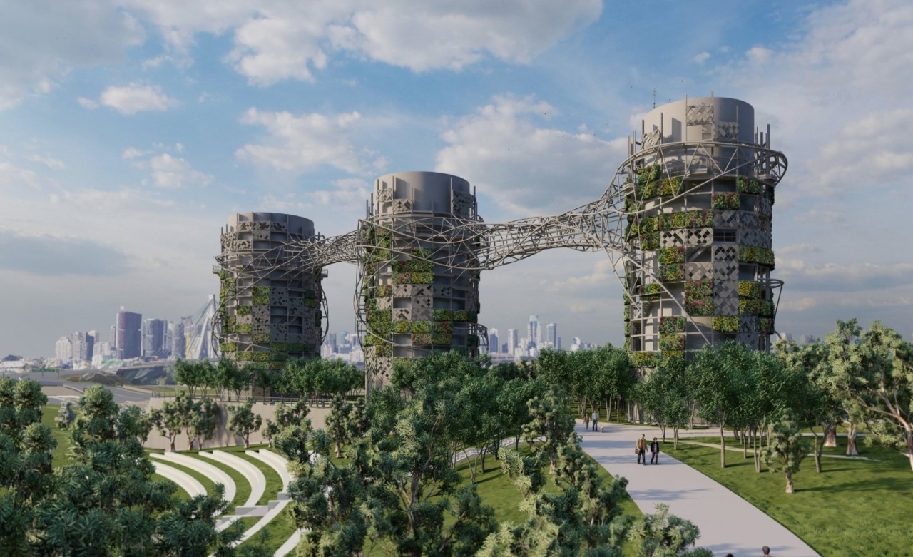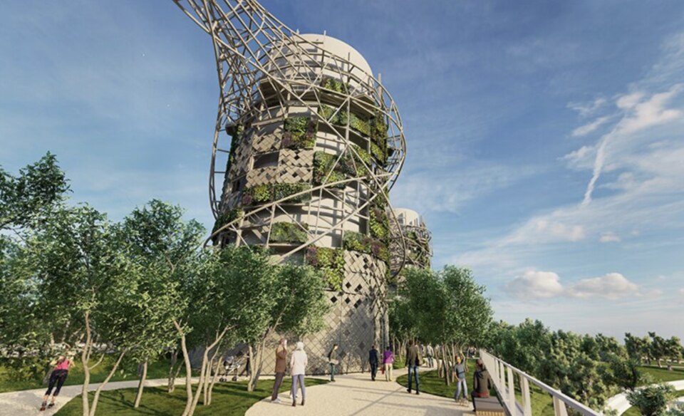 Multidisciplinary designer Chris Fox is developing an urban artwork interweaving between the interchange ventilation towers of Sydney, in Australia. With his work Fox aims to transform the three huge ventilation towers in landscaped monoliths and make the infrastructure more than just functional.