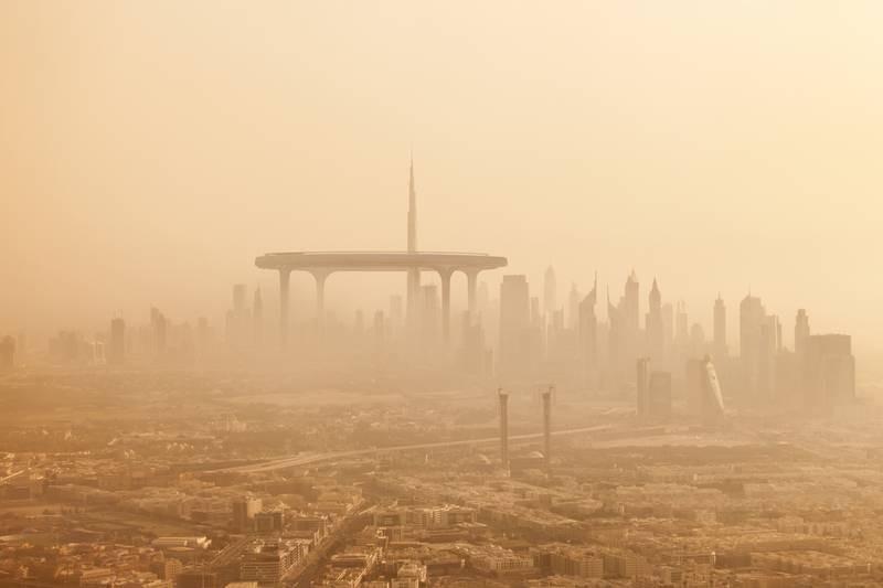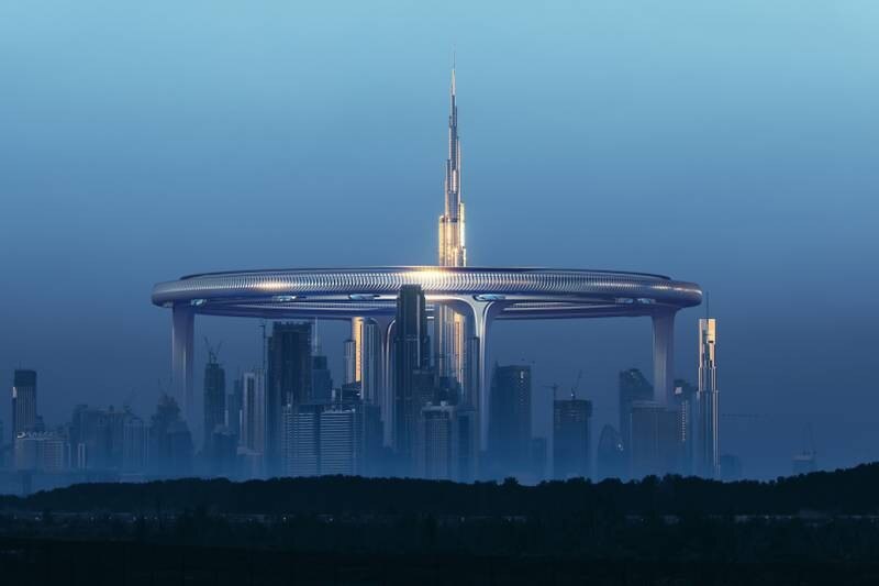 The structure is designed to hover over downtown Dubai and surround the Burj Khalifa. The building is composed of two main rings, which are held together by a green belt, dubbed “Skypark”, which is illuminated with natural light and has offices and research centers embedded.