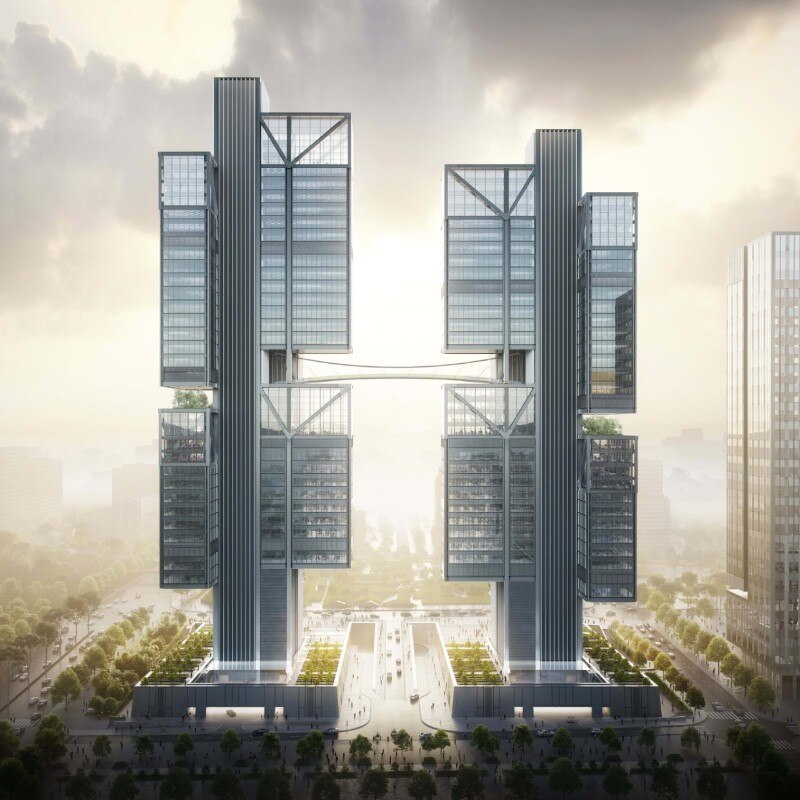 Across the two towers – of 44 and 40 stories – the company’s office, research, and development areas are arranged in volumes cantilevered from central cores by large mega trusses. This is the first use of an asymmetrical suspension steel structure in high-rise towers of this scale and from the distance it seems that the buildings were suspended in the air.