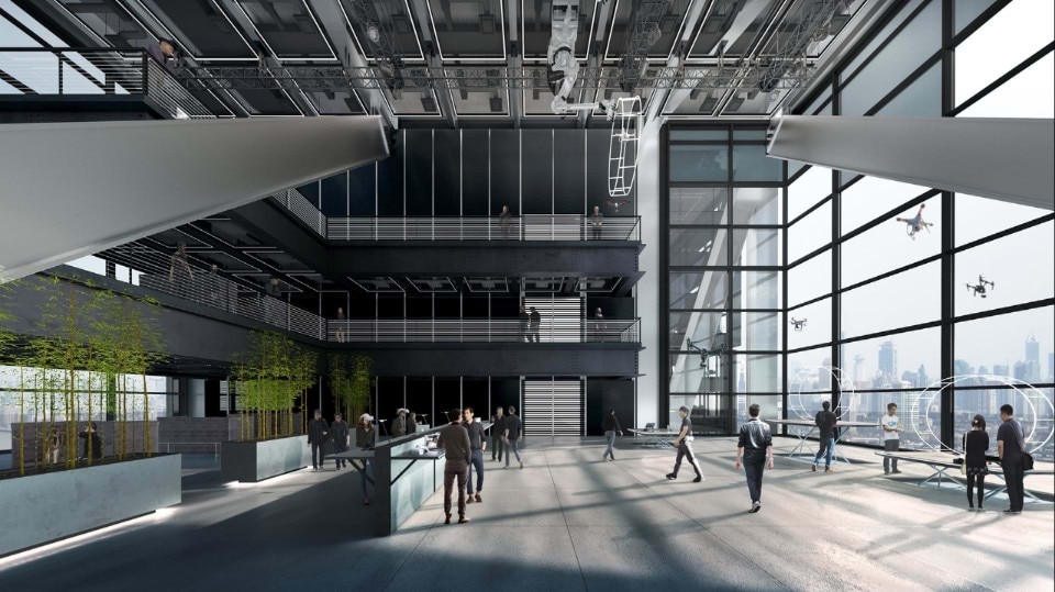 The building also hosts drone flight testing labs over four stories, made possible by the unique V-shaped trusses that that distinguish the two towers against the backdrop of the Shenzhen skyline, giving it a strong identity. The innovative structure reduces also the need for columns, creating uninterrupted working spaces that express “Innovation Without Borders” in architectural terms.