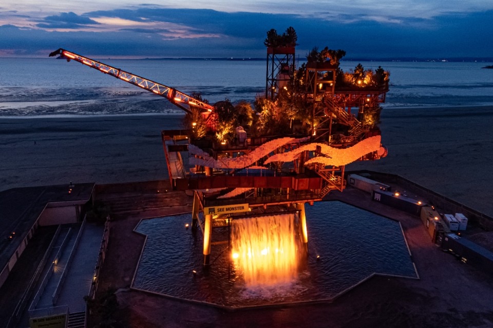 The 450-tonne four-story offshore platform has been located in a shallow pool on the Weston-super-Mare seafront, in Somerset. Its top levels hold a wild garden composed of plants suitable for the Atlantic weather. The art installation features a multi-level slide, a broadcast studio, and an amphitheater, while the platform’s former helideck now functions as a viewpoint and a waterfall falls 10 meters from the bottom floor.