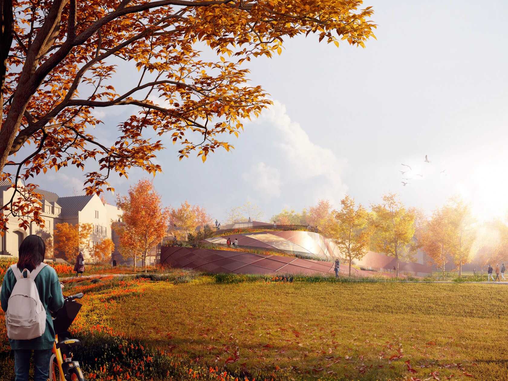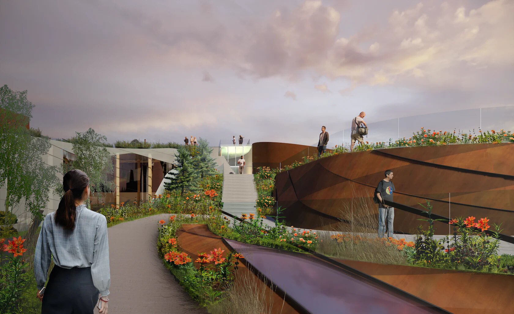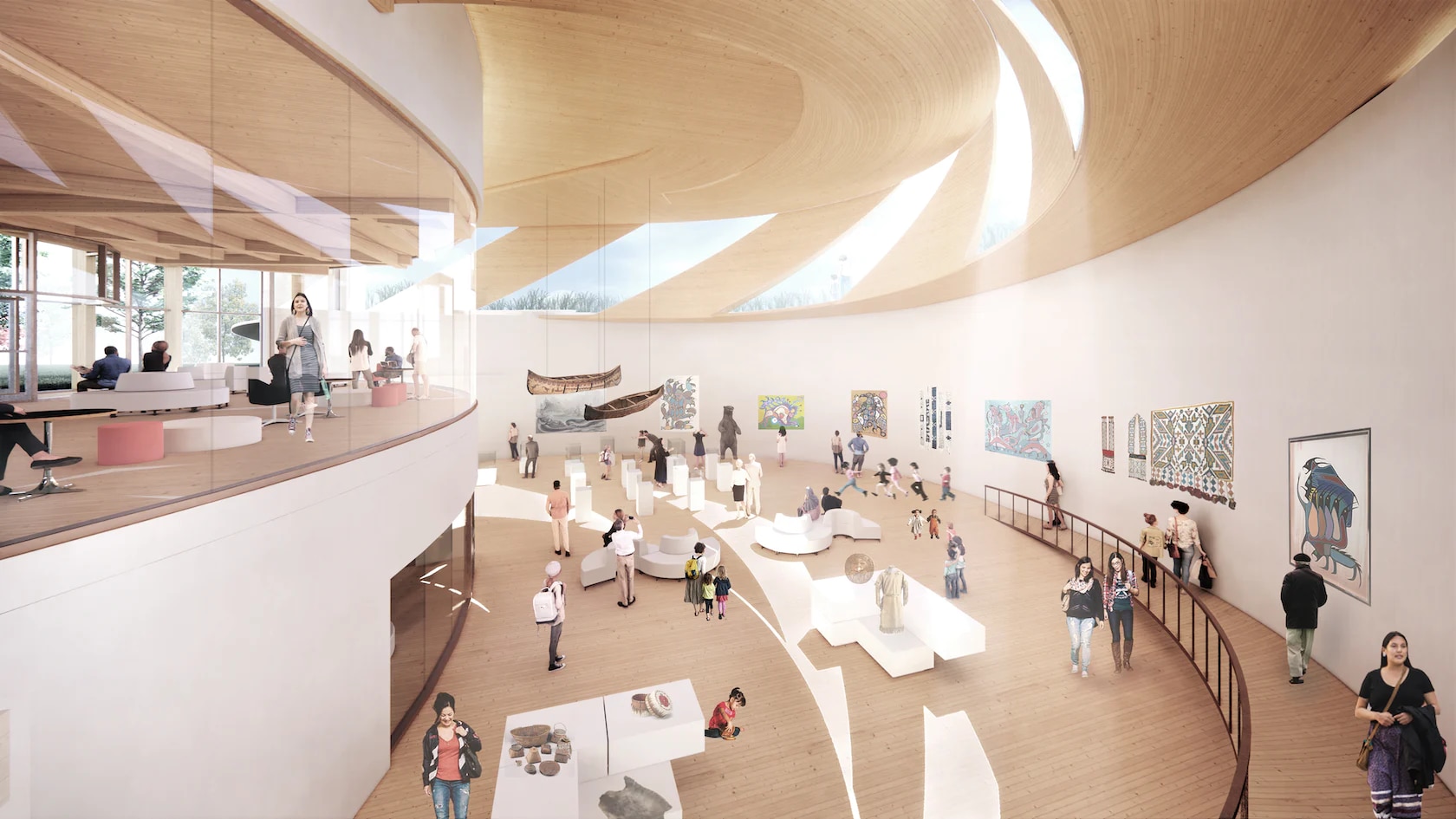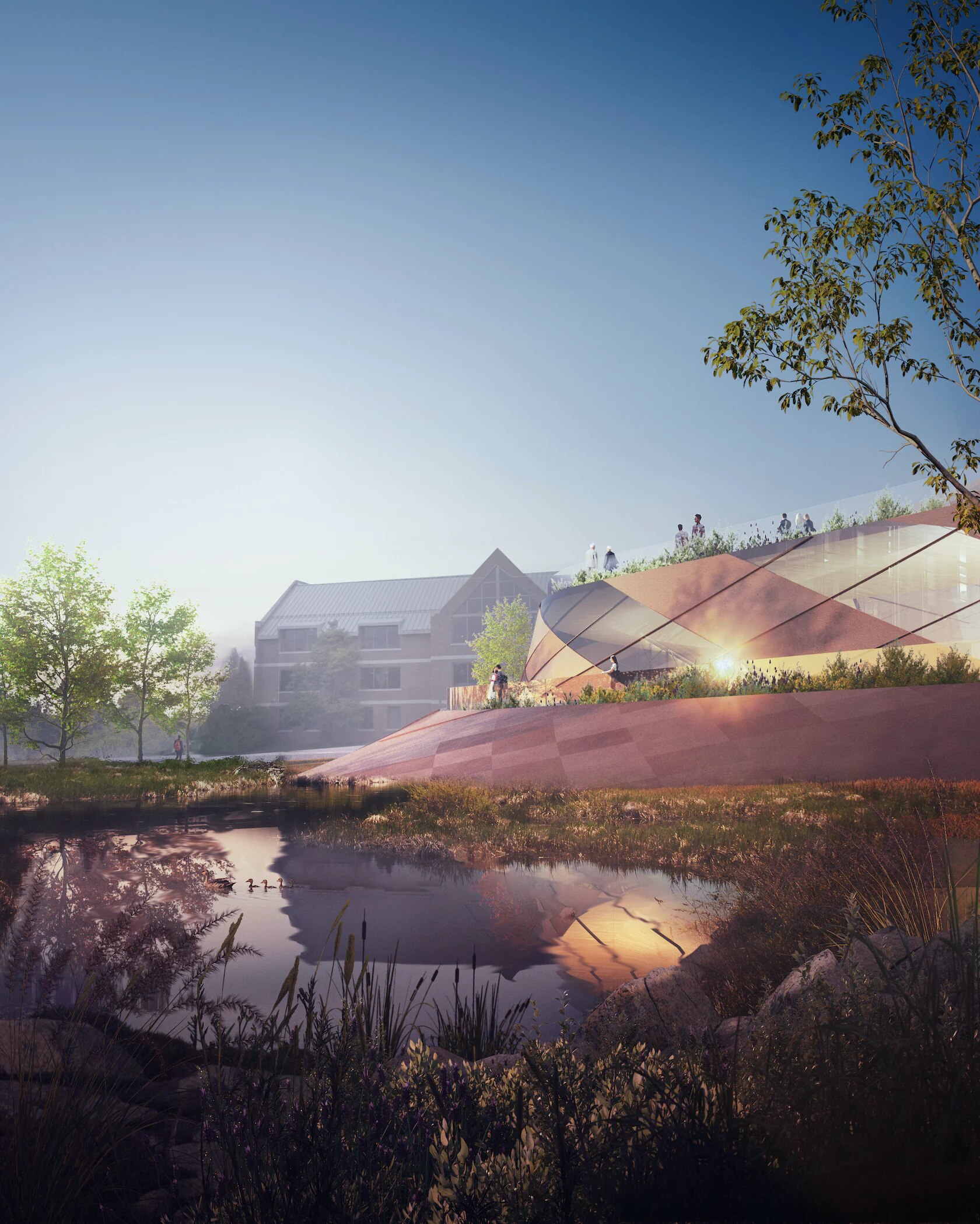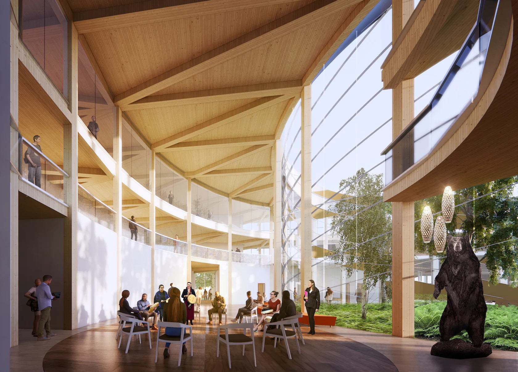 The new Cultural Centre’s design, in fact, has been articulated following Indigenous teachings – from building form to material selection (mass timber). The concept foresees a sloped configuration reminiscent of Mukwa – meaning “Bear”, a figure of healer and protector – who rises from the ground, “walking north” from the origin of life, water, to the spirits, over the mountains, in the sky. The building rises from the earth and stands through three paths representing the past, the present, and the future, rising above the old residential school and thus providing visitors with a privileged point of view from which to relate to the difficult history of the place.