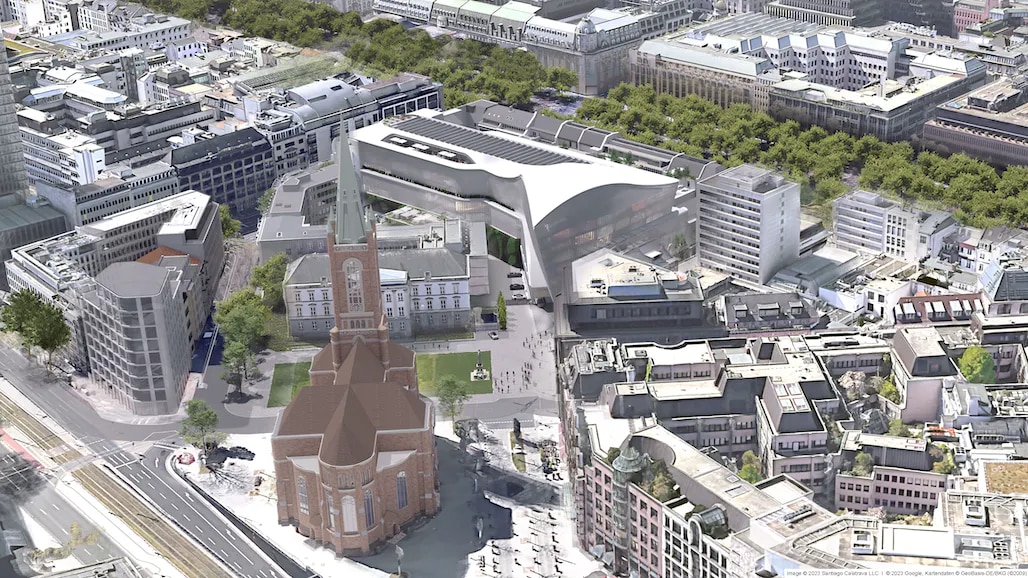The design will feature a curved vaulted roof, 135 feet long and orientated towards Martin-Luther-Platz, which will never exceed the height of the tallest buildings already present in the area. The interior will be covered by what the study described as “sinusoidal waveforms”, which extend outwards to create unity between spaces.