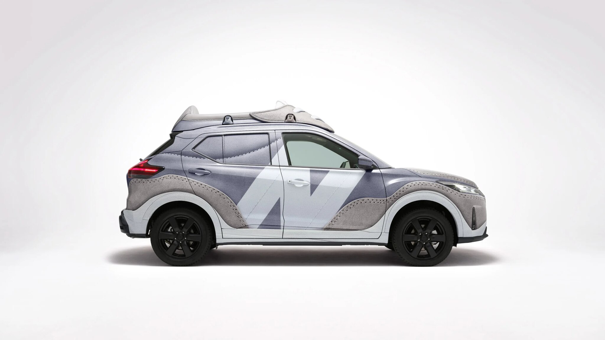 The SUV was wrapped with a special casing to give it the look of a gray New Balance 327 trainer, which according to Nissan would be a shoe already particularly similar in shape to its new SUV. The suede upper of the shoe was reproduced through a graphic print over the wheel arches, while the vehicle’s bonnet was imprinted with huge laces, on the roof instead were replicated collar, tongue, and eyestay.