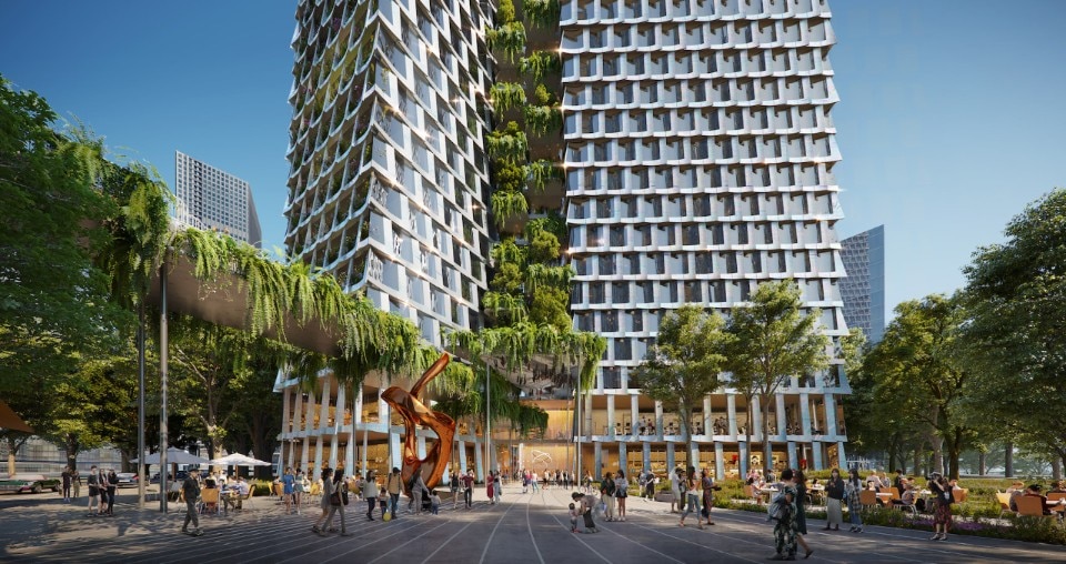 BIG has unveiled the Qianhai Prisma Towers in Shenzhen, China. The two skyscrapers – 300 and 250 meters tall, and conceived as simple and elegant prisms – will rise on either side of the Shenzhen Hong Kong Plaza, designed by Japanese studio Sou Fujimoto and known as the “green belt”.