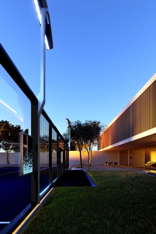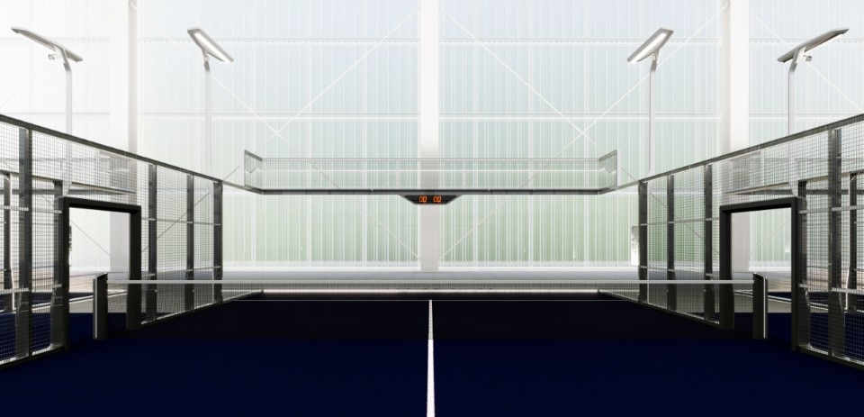 The self-supporting court, which can be fixed directly to the ground, also features innovative details and materials, including fiberglass coating, tempered laminated glass with fixation concealed in the ground and eco-leather protections, as well as LEDs, displays and cameras perfectly integrated into the structure.