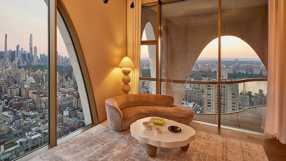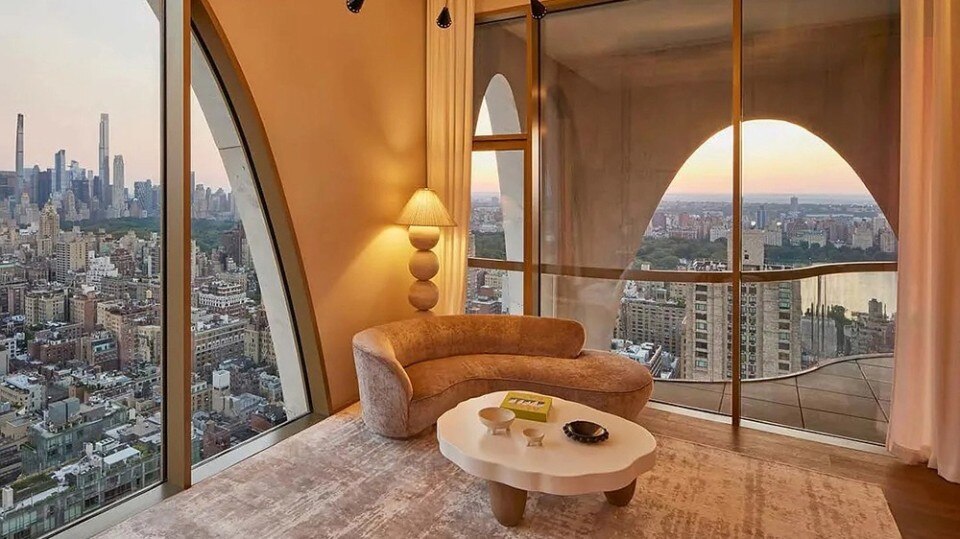 The house has very high ceilings, which in some places reach 28 feet and large floor-to-ceiling windows overlooking Central Park and the city skyline, with exceptional panoramic views. A private elevator runs all three floors, as well as a sculptural spiral staircase.