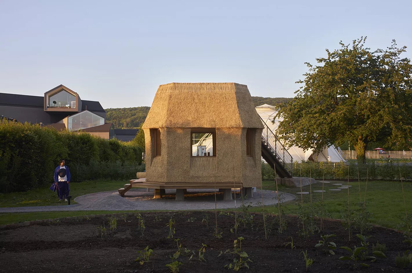 The Tane Garden House has an area of 15 square meters and offers space for garden-related workshops, as well as a meeting room for employees of the Vitra garden. It also houses a rooftop viewing platform from which visitors can enjoy a 360-degree view of the Oudolf Garten, Vitra House, and Umbrella House, as well as the entire campus view. Built with above-ground material – such as stone, wood, straw, and rope – it aims to promote a way of life “with the Earth”, aware of climate change and overexploitation of resources.