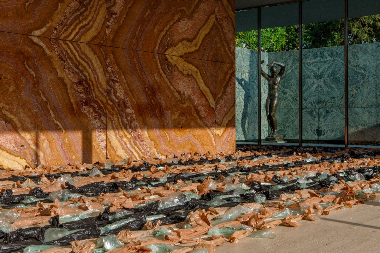 This is the second location that houses the work of Cottle and here “Raft” takes the form of two large carpets, about 13x6 meters, composed of almost 10,000 plastic bags of different colors, selected and recovered by the artist from the garbage cans of Barcelona. A carpet is located inside the Pavilion and surrounds the famous onyx wall; the other was placed outside, on the water of the pool, as a kind of large floating plastic raft. Each bag is a symbol of “single-use culture” and implies a transaction, the tangible residue of consumed goods, and only sometimes reused.