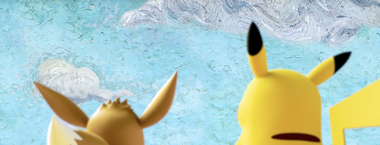 In the presentation trailer, Pikachu and Eevee run in the middle of a field of sunflowers with many windmills in the background. Then, a drop of paint falls like rain on Pikachu’s head and the sky becomes post-impressionist, with the characteristic curls of the Dutch painter. Sunflowers turn into Sunflora, a grass Pokémon, and then a version of the “Sunflowers” appears with the Pokémon in its center.