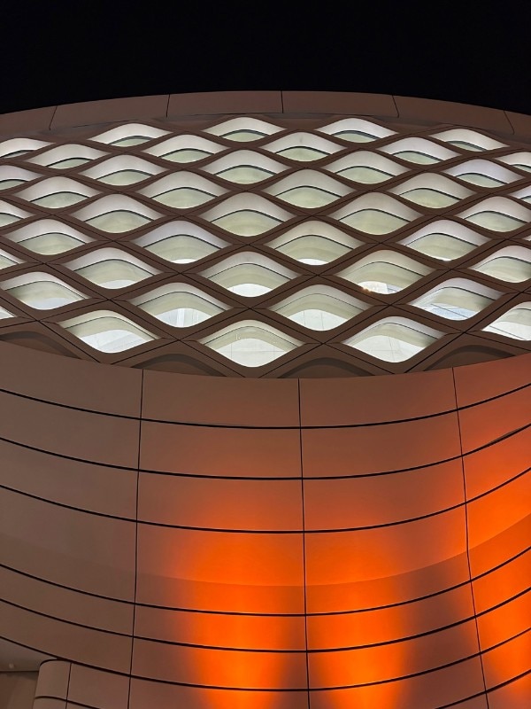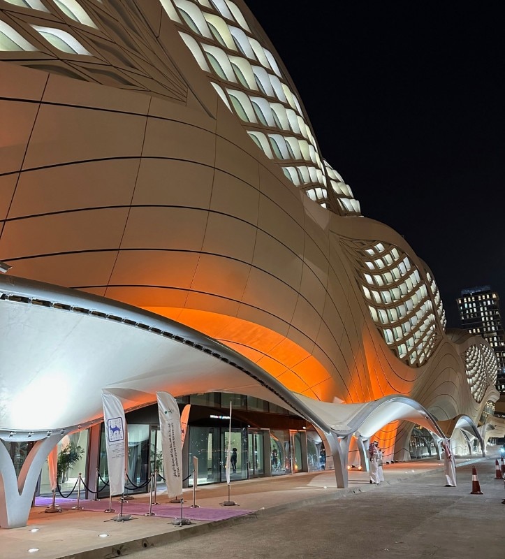 The six platforms are arranged over five floors and encased by a steel structure characterized by a series of curved shapes inspired by the mashrabiya panels, as well as by the desert dunes and the waves obtained from the mapping of the projected pedestrian paths.