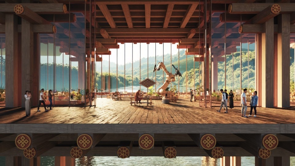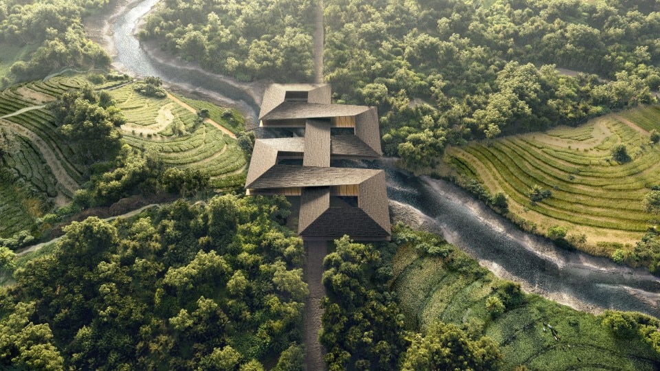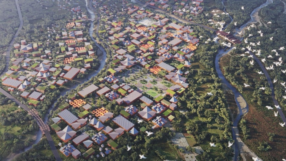 The project also incorporates a hydroelectric dam with a temple, the Sankosh Temple-Dam. It resembles a contemporary step-well, featuring typical staircases and viewpoints, blending religion and hydraulic functionality, as well as urban and social infrastructure. The buildings will be constructed using local materials such as wood, stone, and bamboo, situated alongside permeable paved streets.