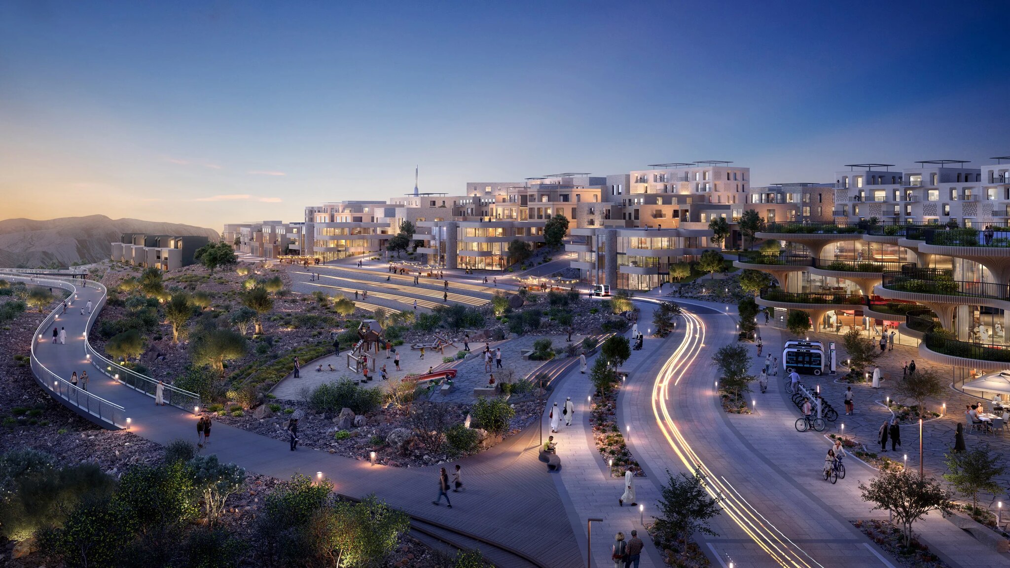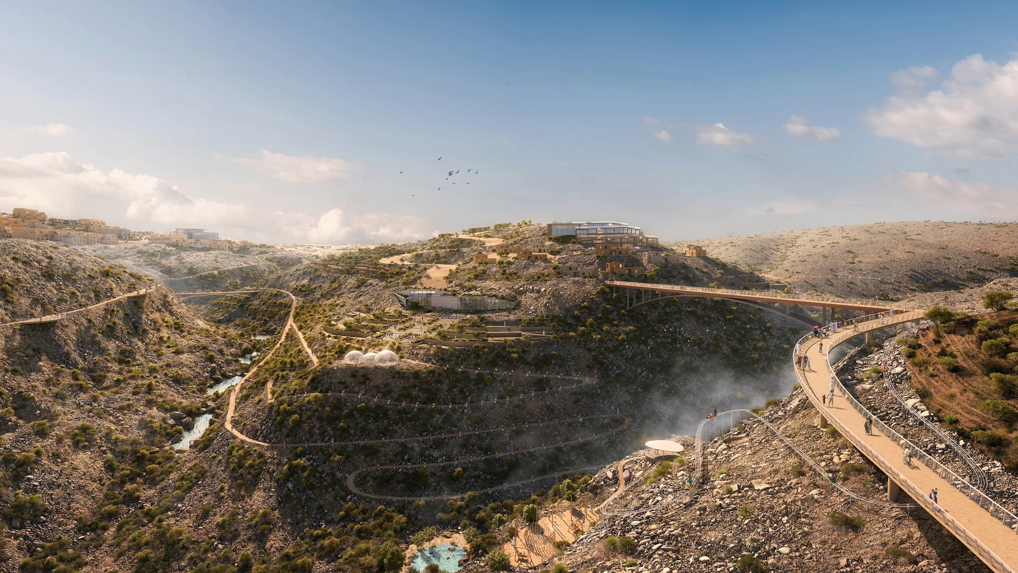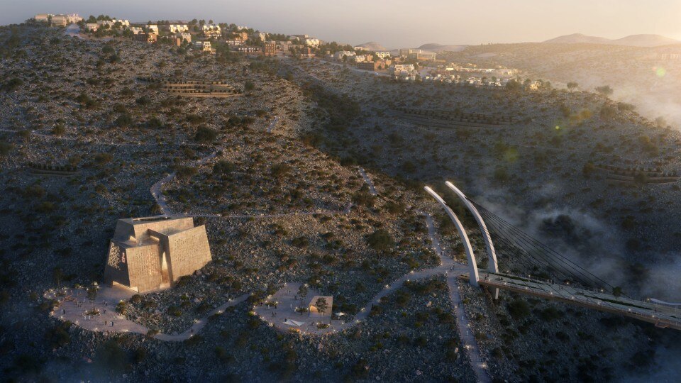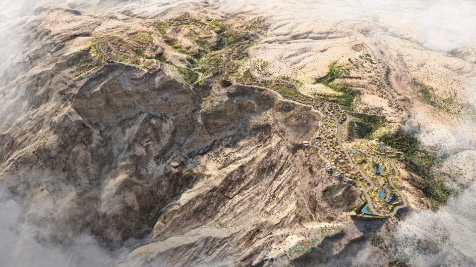 Oman is building a new mixed-use complex for 8,000 people on the mountain range of Jabal al Akhdar, at an altitude of 2,400 meters. With a master plan designed by the engineering firm AtkinsRéalisa, Omani Mountain Destination will comprise three villages spread across various mountain peaks and connected by a network of trails, bridges, and roads. The primary mode of transportation will be a cable car.