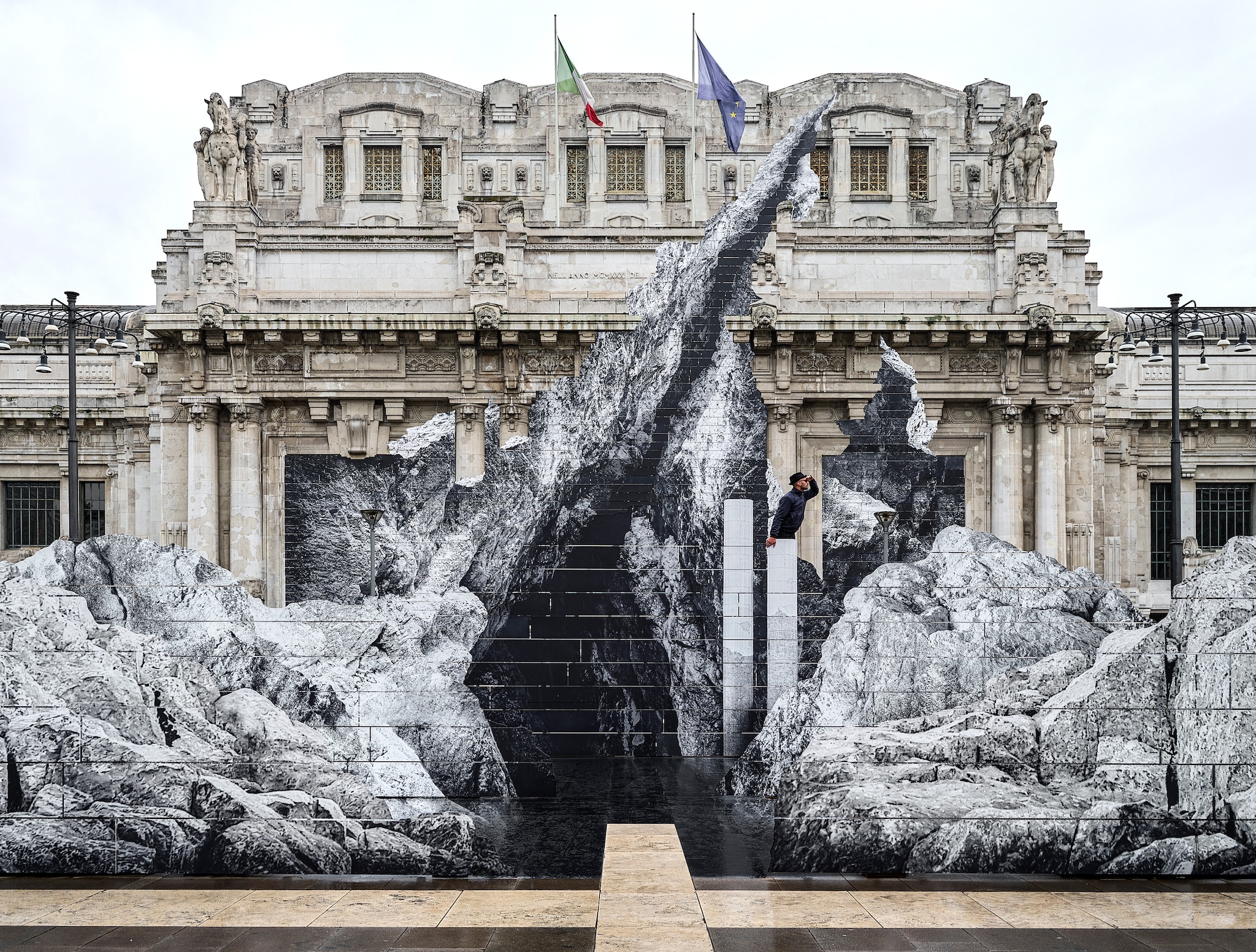 This is one of the narrative threads of JR’s artwork; the installation indeed recalls the historical origin of the station, built following the opening of the Sempione Tunnel in 1906, the monumental engineering feat that marked the beginning of the era of large train journeys from Milan. In this case, too, JR opens the station’s facade with a tear, using a technique never used before: the image was indeed printed directly on aluminum panels, without using paper and glue. In addition to facing the facade, these metallic elements are scattered around the square, allowing spectators to enter and interact with the artwork. The result is a surreal architectural fantasy that blurs the boundaries of time and place.