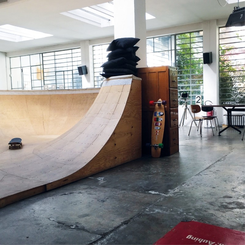 Turin is a city with a powerful underground culture that emerges at different levels, even where you least expect it. 515 is a communication and design agency with an exhibition space and a skateboard ramp at its center. The wooden ramp that dominates the space also functions as a bookshelf and can be used as a seating area. The large industrial windows, which once belonged to a pinball factory and later an art gallery, overlook a tree-lined internal courtyard. For the occasion, Gosia Turzeniecka's exhibition will be installed in the space, with an irregular and free arrangement of surrealistic lightness.