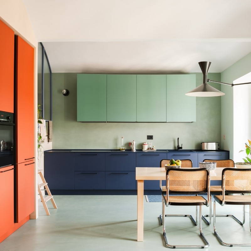 On the top floor of a building in San Salvario district, this typical Turin apartment overlooks the surrounding rooftops. The choice of colors and their combination is the language through which the personal sensibility of a couple of designers – Unduo and Andrea Zanero – becomes a home. The interiors, completely renovated with informal solutions, pay great attention to light.