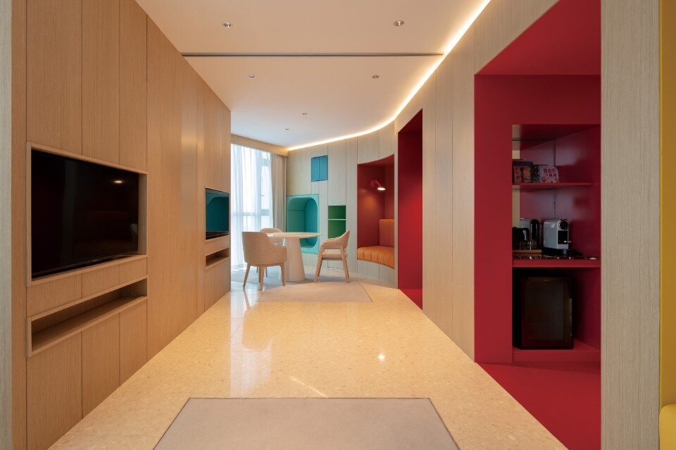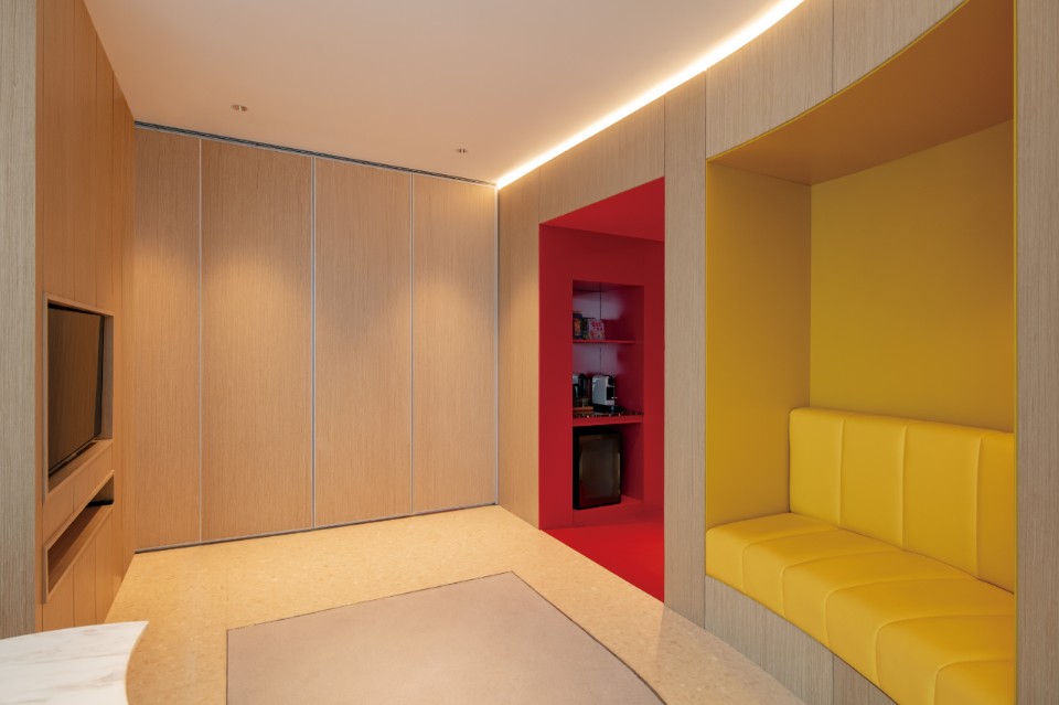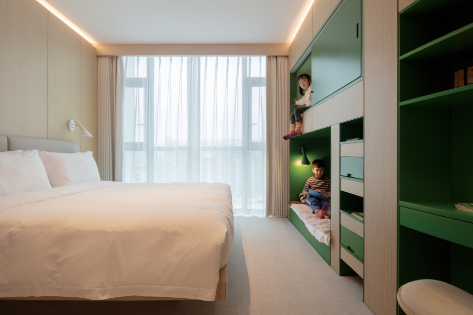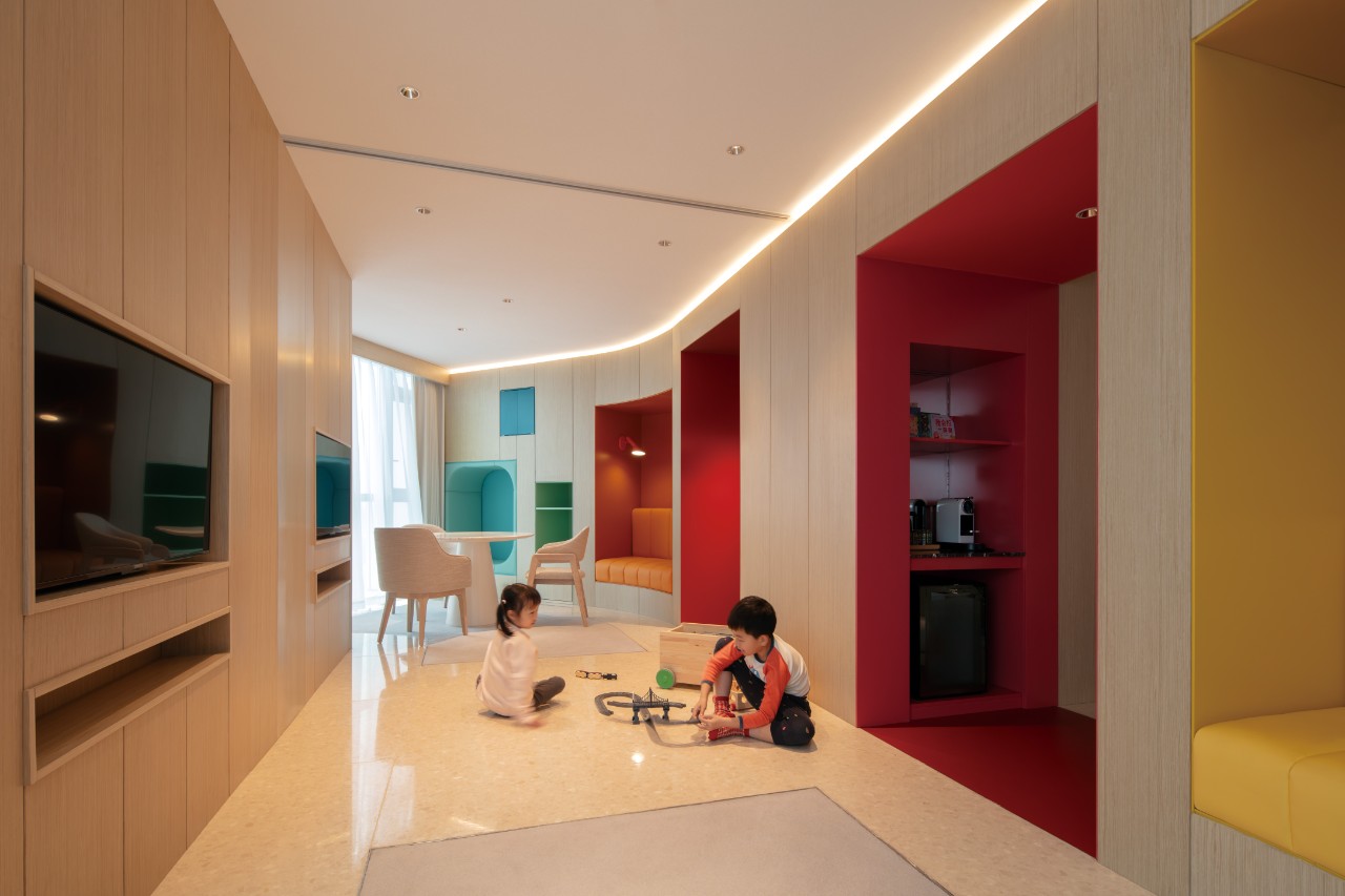 The building’s plinth now hosts a wide range of facilities for the well-being of women and children, while the tower accommodates 194 hotel rooms. Each floor of the hotel features special rooms designed by various architects who have enriched the interiors with their styles and design ideas. The two MVRDV suites can be combined into one shared space for larger families and are animated by a meter-thick inhabited wall that curves through the space, with colorful niches offering various functionalities, from traditional items like closets and desks, to unexpected additions, like toy storage or hidden bunk beds. Since no two families are alike, flexibility is the fundamental principle that guided the project.