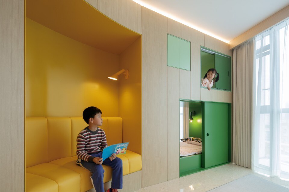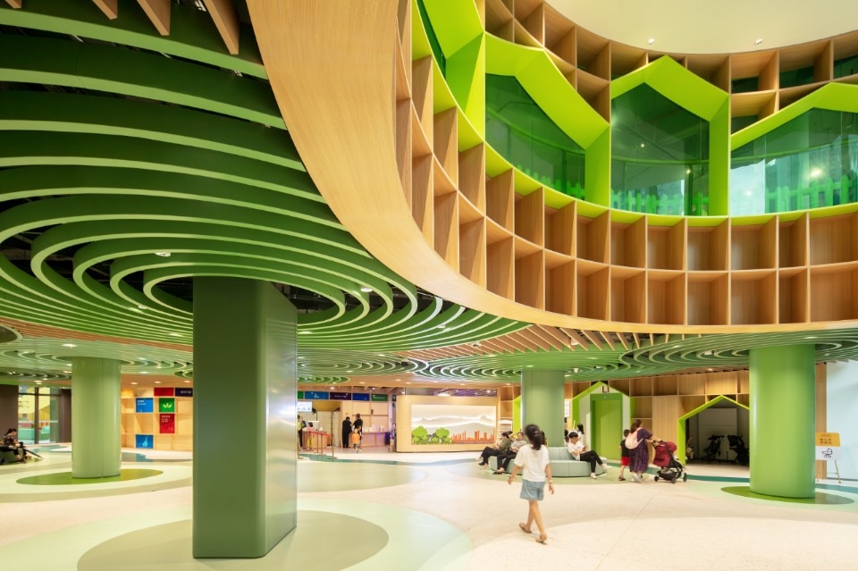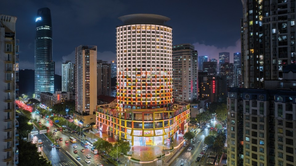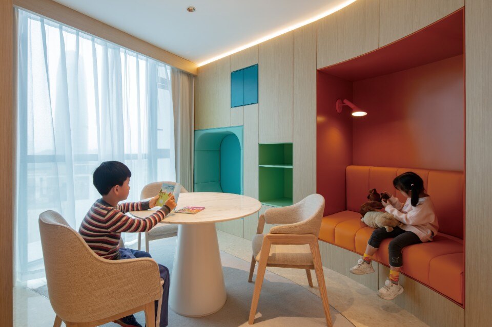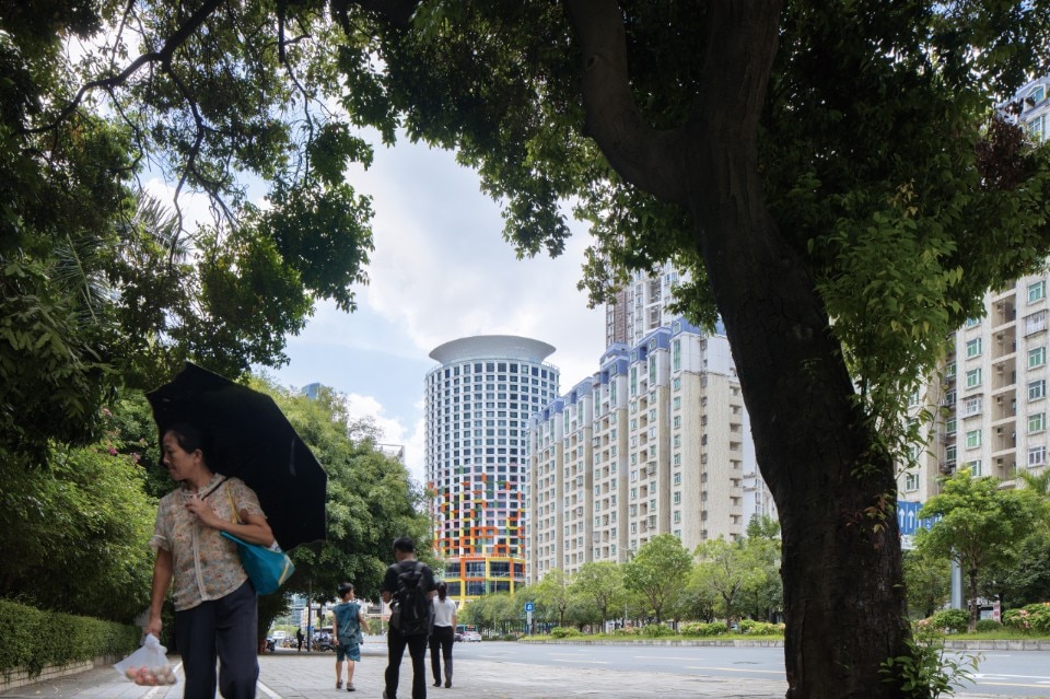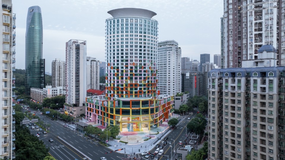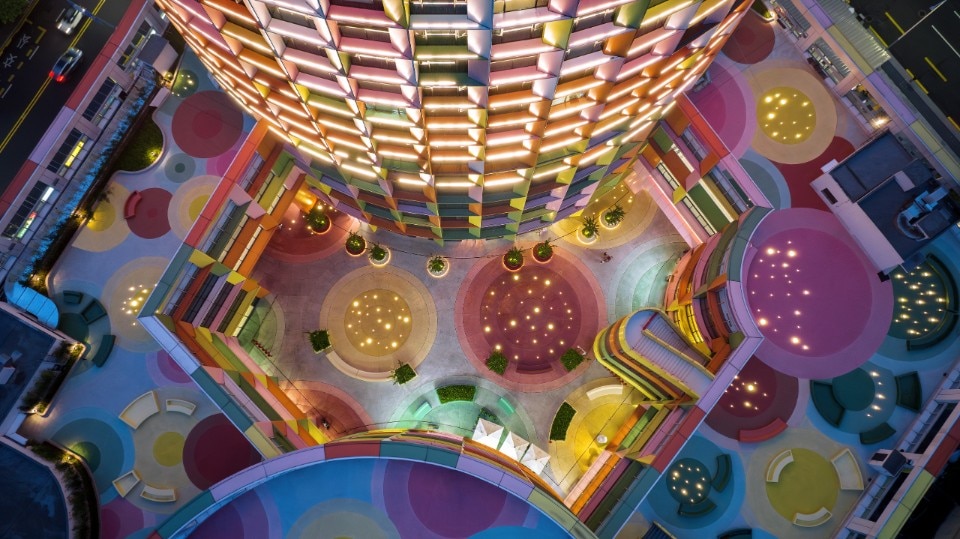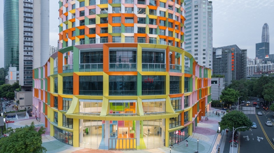 MVRDV has completed a pair of family suites inside the Shenzhen Women & Children’s Centre, a 100-meter-tall tower from 1994 that the studio recently renovated, transforming it into a colorful and welcoming facility for the well-being of women and children. The renovation project preserved the original concrete structure, with its 24,000 cubic meters of concrete, and features a grid of multi-colored exterior frames that improve the performance of the facade. It also transformed the building’s courtyard from a parking lot into a public space and created a pedestrian tunnel to provide direct access to the metro.