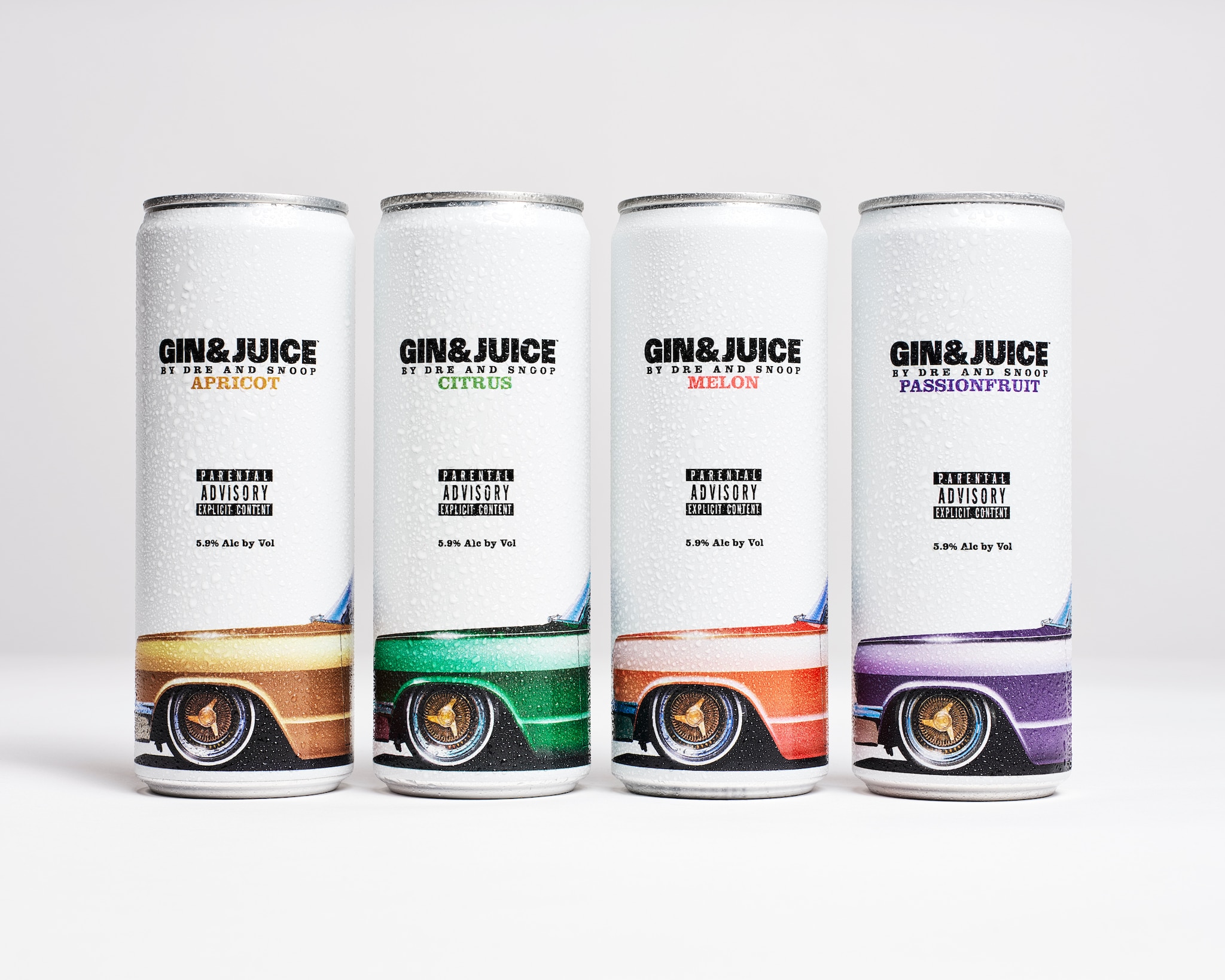 The designer created the packaging for Gin and Juice, the beverage line by Dr. Dre and Snoop Dogg. The can graphics feature the “Parental Advisory, Explicit Content” iconography.