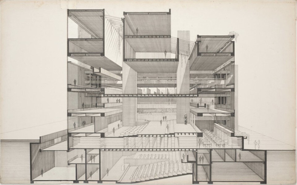 Known for his bold and expressive use of space and materials, unlike his modernist peers, Rudolph was famous for his use of complex volumes and textures. A highlight of the exhibition will be the designs for the Lower Manhattan Expressway / City Corridor, a visionary master plan conceived between 1967 and 1972 to address New York’s traffic congestion but never realized: a massive elevated structure that integrated residential, public, and commercial spaces. Also featured will be materials for the Art and Architecture Building on the Yale University campus, completed in 1958. This building, with its solid concrete facade, is considered a masterpiece of Brutalist architecture. The intricate interior spaces are a perfect example of Rudolph’s compositional mastery in assembling dynamic and engaging spaces.