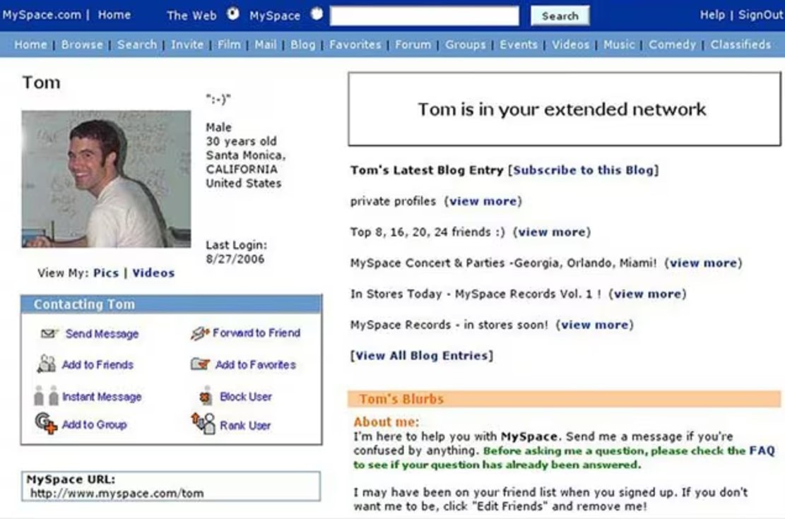Tom was Tom Anderson, one of MySpace’s co-founders. Somehow, Tom managed to become an exception – besides being as unavoidable as that time Apple snuck a U2 album onto everyone’s iTunes, he was the only real person among a crowd of fictional names. The first name + last name combination was practically banned. The platform’s most famous figure was Tila Tequila – and “Tequila” was surprisingly not her real last name.