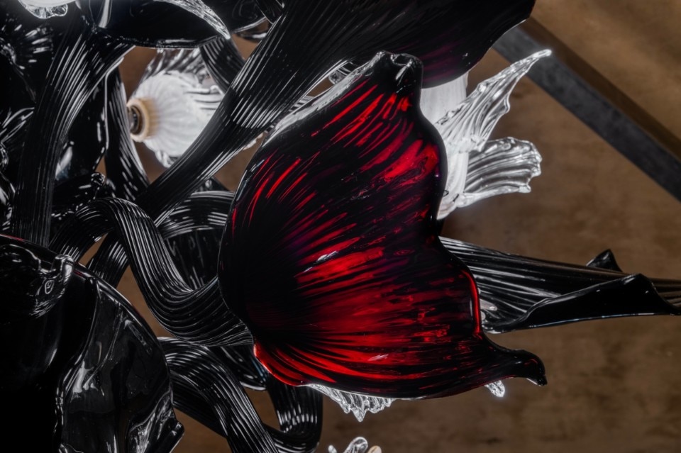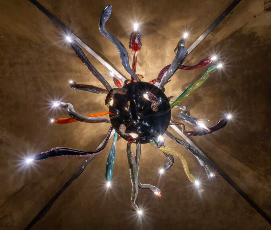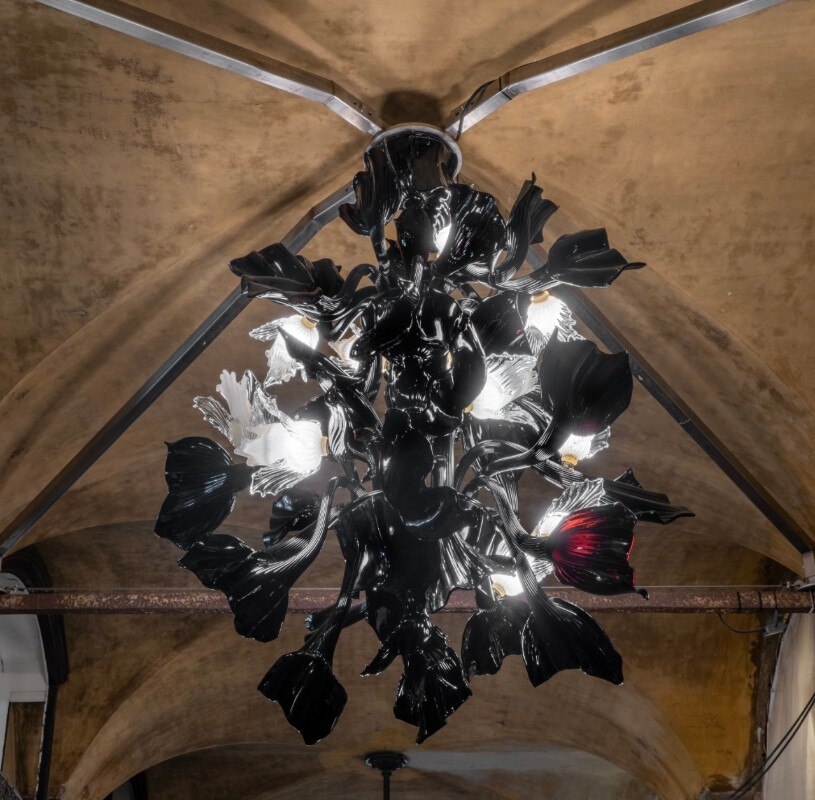 Floral themes return in Colpo di vento, a chandelier by Kimiko Yoshida made in collaboration with the Fornace Seguso Gianni Murano. Inspired by the hues of cherry blossoms—a national symbol of Japan—the piece merges Venetian Rococo and Japanese minimalism. Equally notable are the “scaled” experiments of American artist Deborah Czeresko, who, working with the Fornace Massimiliano Schiavon Art Team, replaces the chandelier arms with colorful serpents, subverting the sound of light emitted from their tongues as a benevolent presence.