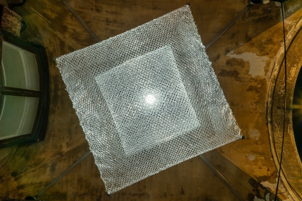 For example, the renowned conceptual artist Joseph Kosuth, in collaboration with the Fornace Barbini Specchi Veneziani, has created his first work ever to diverge from his signature use of neon. For Enlighten’s the Word, Kosuth chose mirrored glass, designing an abstract silhouette of a classic Rezzonico chandelier and making it three-dimensional and self-reflective. Perfectly centered under the vault, the work plays with mirrors and symmetries, offering a near-transparent viewing experience.
