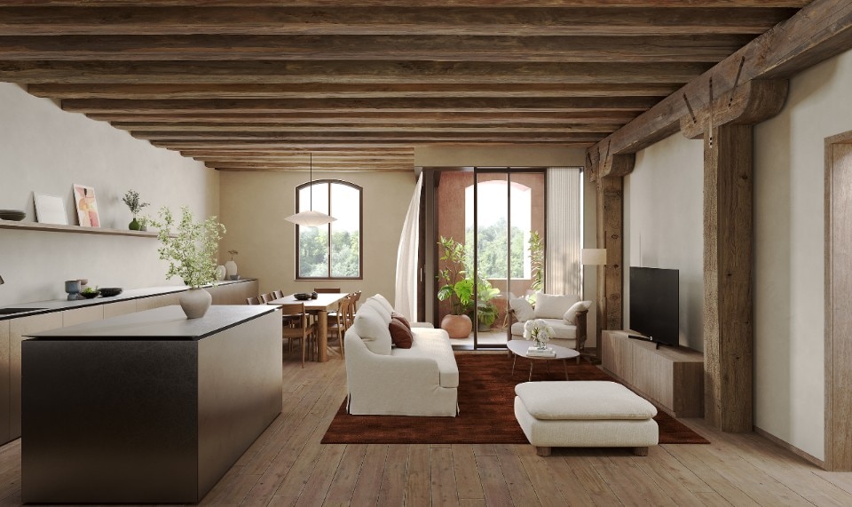 The monumental seventeenth-century mill will house 17 flats of various sizes, 21 units intended for tourist rentals, and 7 units for offices, while the 7 twentieth-century houses on the river will be reconfigured to house dwellings with gardens.