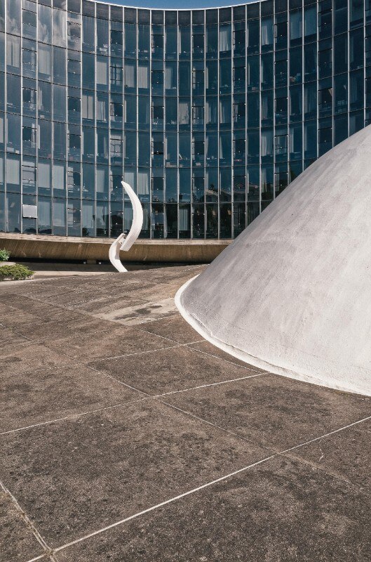 The complex includes an S-shaped building supported by just five pillars, an underground connecting system, and a white reinforced concrete dome that rises above the exterior plaza floor, serving as the ceiling for the 300-seat underground congress hall.