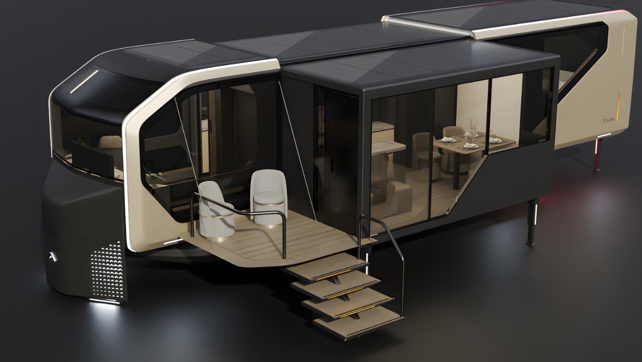 The first model, Unit, transforms to offer 37 square metres of indoor living space and includes an outdoor terrace. Equipped with solar panels, water generators and intelligent technology, it is designed to be installed anywhere and is built on a platform to facilitate transport. The interior is designed around a flexible area that can be used as living space or a private room as required. The Trailer and Drivable models, on the other hand, are designed to be moved frequently: the former is towed and the latter - already unveiled at CES 2024 - is a camper version.
