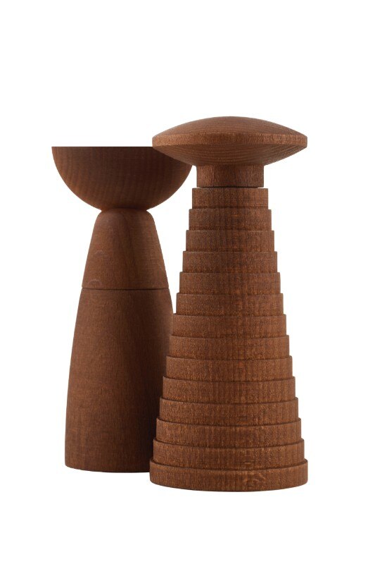 Also by De Lucchi, from April, Yucatan and Oaxaca, salt and pepper grinders with a strong sculptural charge, two small totems in beech wood, reminiscent of Aztec poles.