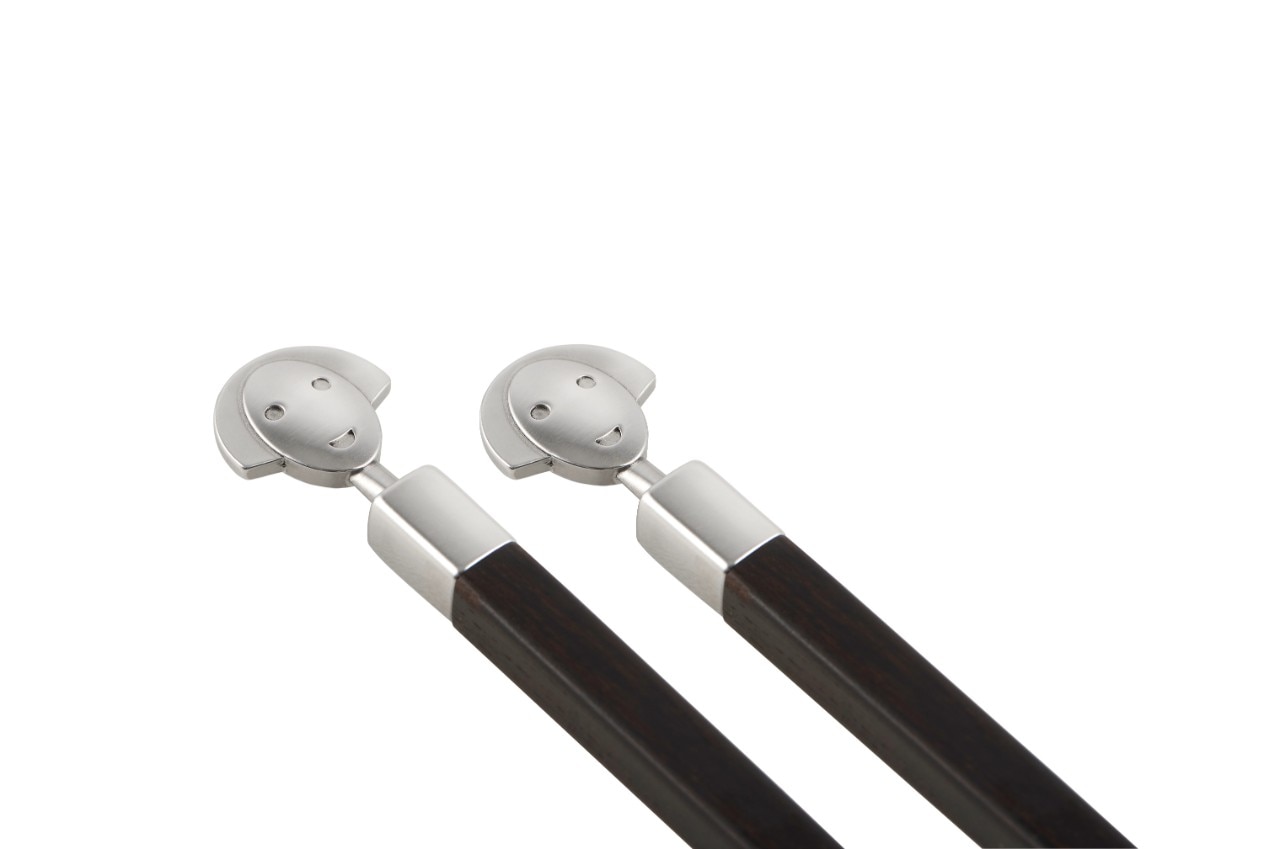 Another great name associated with Alessi is Alessandro Mendini, who designed the iconic Anna G. corkscrew for the steel company, with its anthropomorphic shape as a tribute to his friend and designer Anna Gili. An ironic and perfectly post-modern object, revived in a project by the Milanese designer, kept in the Mendini studio and never before launched on the market: a pair of ebony chopsticks that culminate in the face of Anna and Alessandro, “poetic and sympathetic objects, refined and allegorical, but also endowed with simplicity, solidity and ease of use”.