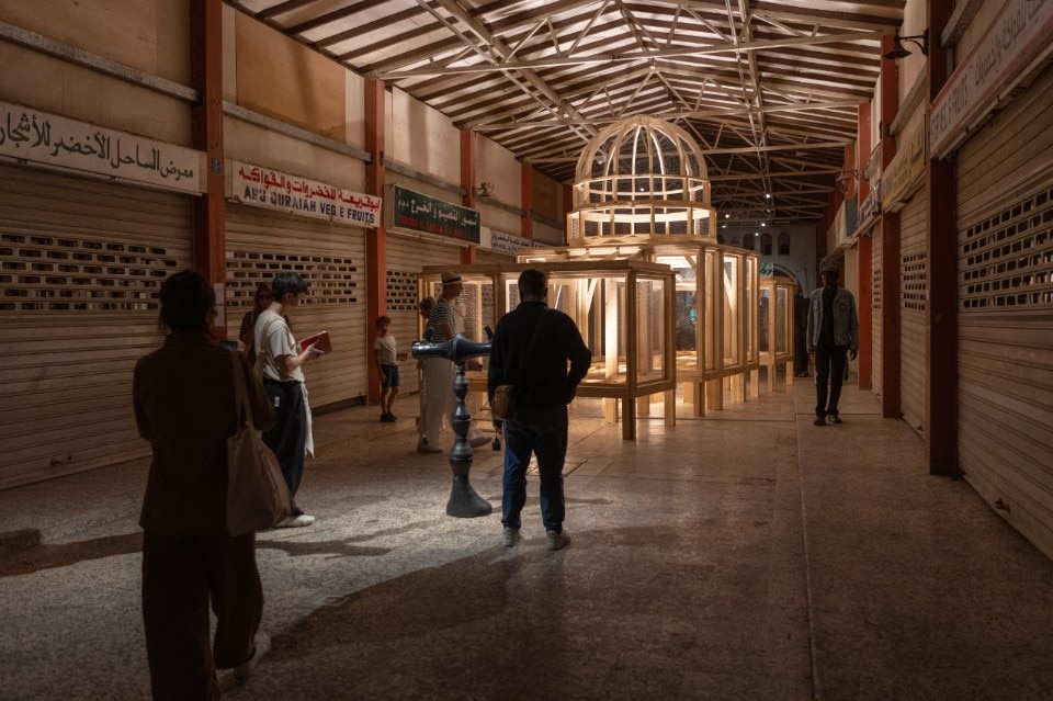 On the waterfront, the Old Al Jubail Vegetable Market (Halcrow Group, 1980s) is an architectural "jewel" with its curved arcades, terrazzo tiles, arched windows and vintage signs. The once vibrant spaces of food trade and social relations resonate with ecosystemic and agribusiness reflections combined with ironic reinterpretations of imperialist politics, including a macroscopic wooden sculpture depicting the US Capitol as a chicken coop (Sakiya, “Capital Coup”).
