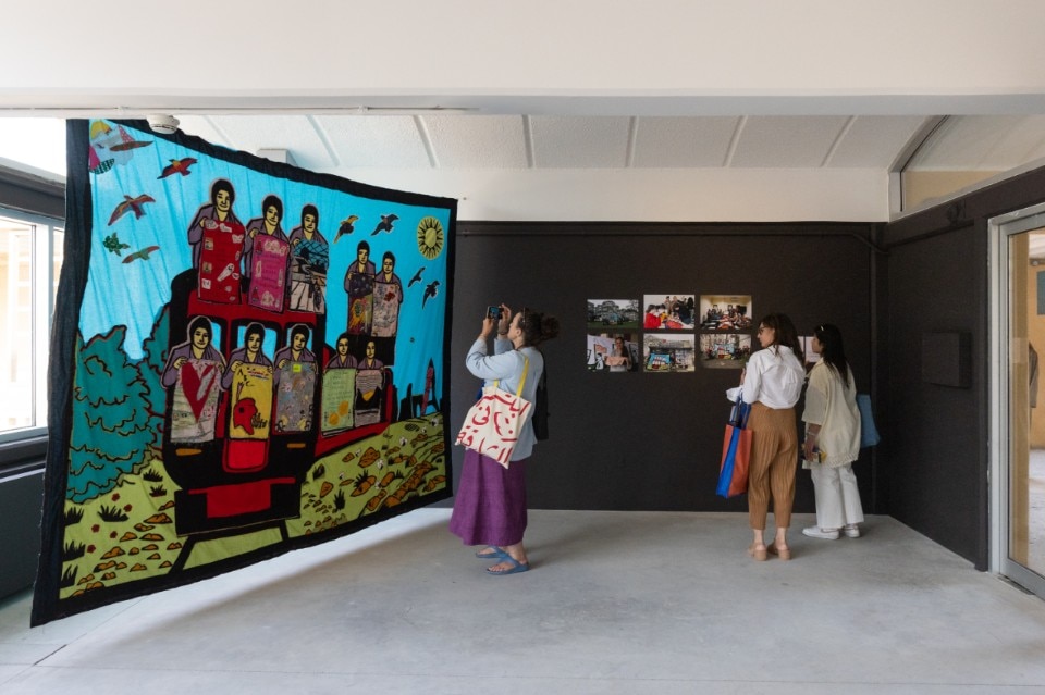Here, the theme of collective healing from pain and the need to transcend the boundaries of mainstream information is captured in the textiles byTurkish artist Güneş Terkol, made in collaboration with immigrants and victims of domestic abuse.