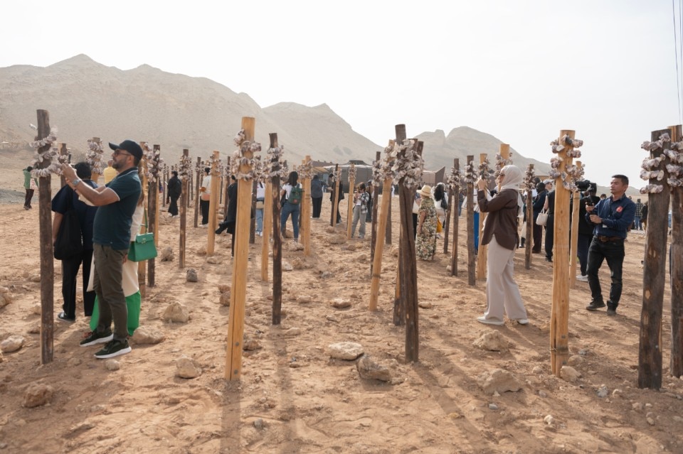 Outside the city, in the Central Region, natural scenery takes over man-made space. In the moonscape of the Buhais Geological Park, the installation of wooden poles and oyster shells recalls the marine ecosystems and architecture of Australia's Quandamooka region, destroyed by unconsidered extractive policies (Megan Cope, Kinyingarra Guwinyanba).
