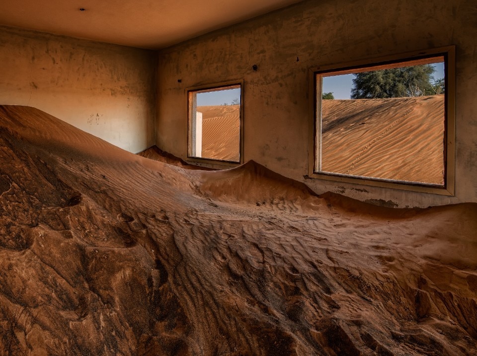 The buried village of Al Madam, built in the 1970s as a housing district for workers and then abandoned due to extreme climate conditions, deals with the transience of anthropic signs in the landscape, in this case visible in the remains of dwellings progressively (and cathartically?) swallowed up by the desert sand.