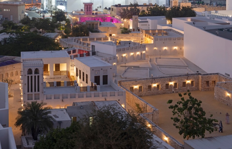 The epicentre is Al Mureijah Square, which coincides with the original urban centre, where SpaceContinuum Design Studio renovated five dilapidated buildings in 2013 by preserving their plan-volume characteristics to create an exhibition area of approximately 2,000 square metres: historical coral walls interact with immaculate contemporary volumes that let light in from skylights and large glass façades, connected by overhead walkways and arranged in a sequence of courtyards, alleys and squares. Here, a series of works including sculptures, photographs, installations and audiovisuals proposes a reflection on the genesis of new identities triggered by cultural stratification and hybridisation: among the many, the Peruvian llama "contaminated" by tins and toilet rolls as symbols of consumerism (Claudia Martínez Garay, "Chunka Tawayuq Pacha") and the red grand piano, in perfect operation, carved with silhouettes of the Maori culture (Michael Parekōwhai).
