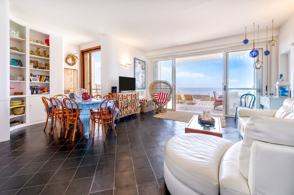A fluid interconnection of rooms, in an ideal progression from the entrance towards the sea, connotes the interior. On the ground floor, there is a bedroom, a study and a bathroom, the kitchen and the living area that opens onto a large terrace with a whirlpool bath; on the first floor, there is the sleeping area with two bathrooms, three bedrooms and a balcony bordered by an iron parapet that seems to be sucked in by the sea undertow.