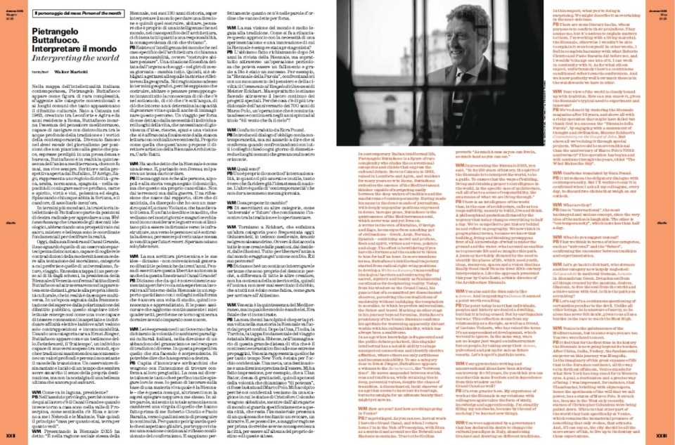 The complex figure of Pietrangelo Buttafuoco is sketched by the Editorial Director, revealing his unconventional thinking and stimulating vision for the Venice Biennale, an intellectual who, with singular dialectical elegance, challenges the commonplaces of cultural debate.