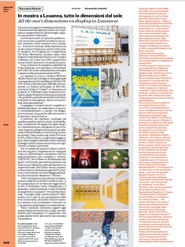 The Reviews section offers further food for thought with Alessandro Benetti's analysis of the "Soleil.s" exhibition at the Solar Biennale, an elegant exploration of the multifaceted dimensions of solar energy as a driver of a desirable ecological transition. Alberto Mingardi delves into the significance of international trade, unraveling the intricate dynamics underpinning global economic growth.