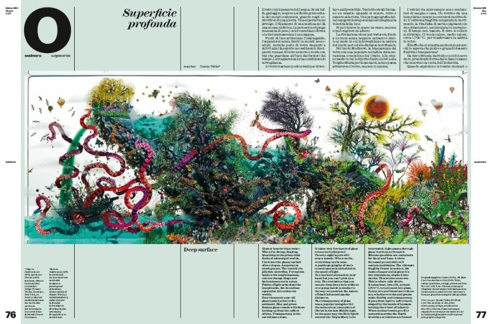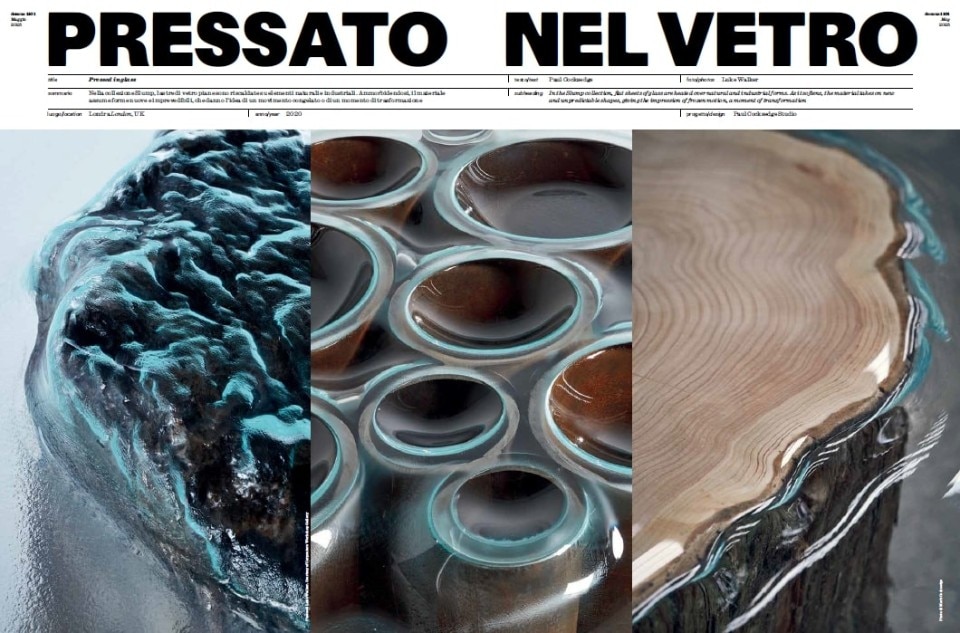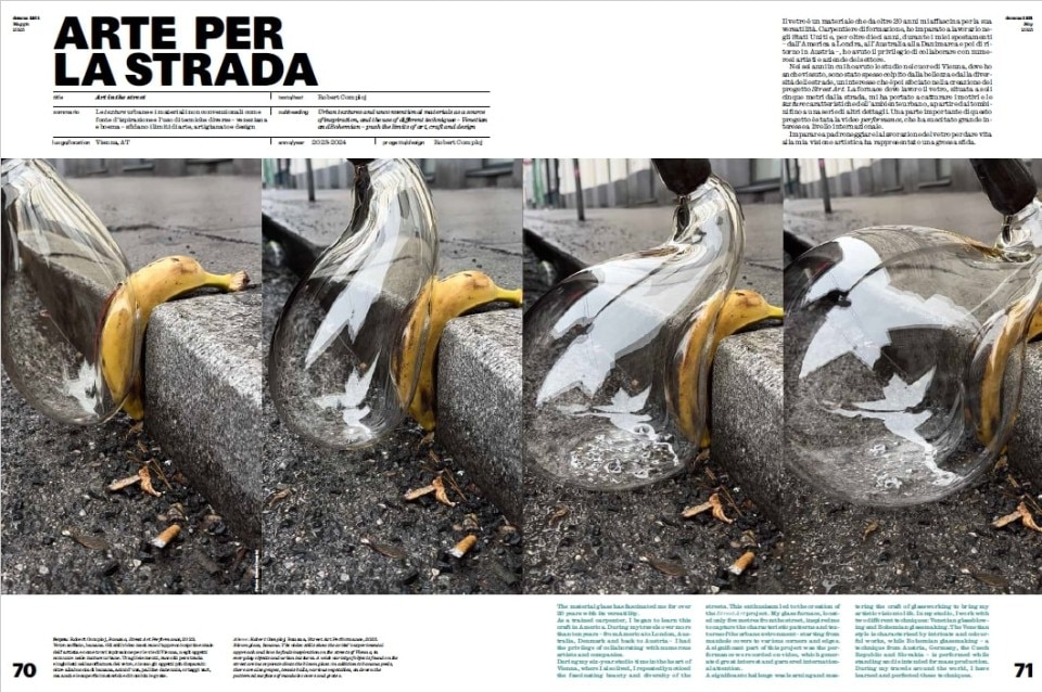 The issue concludes with the art section, featuring the works of Robert Comploj, who masterfully incorporates urban artifacts into Venetian and Bohemian blown glass, and Dustin Yellin, whose essay "Oxymoron" offers a poetic reflection on glass's paradoxical nature, accompanying his layered sculptures that encapsulate complex narratives. The cover story celebrates fused glass, a material that Lasvit has expertly manipulated to express the inherent materiality and imperfection of glass, in an homage to its nature as solidified liquid.