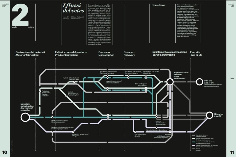 The visual narratives are crafted by Filippo Cartapani and Shane Dalke, architects from BIG working alongside the Guest Editor, providing a succinct yet comprehensive analysis of this potent material. "The flows of glass" maps out its intricate production chain and the challenges inherent in its recycling. "Types of glass" delivers a technical overview of the various manufacturing processes and their resulting properties.Our studio visit transports us into the creative realm of SANAA, through a captivating dialogue between Bjarke Ingels and Kazuyo Sejima – a rare meeting of two towering figures in architecture spanning the late 20th and early 21st centuries. The interview illuminates how the Japanese practice has explored glass not merely as a clear divider but as a material with its own distinct identity, shaping fluid and unexpected spaces in such iconic projects as the Toledo Museum of Art Glass Pavilion and the Rolex Learning Center.