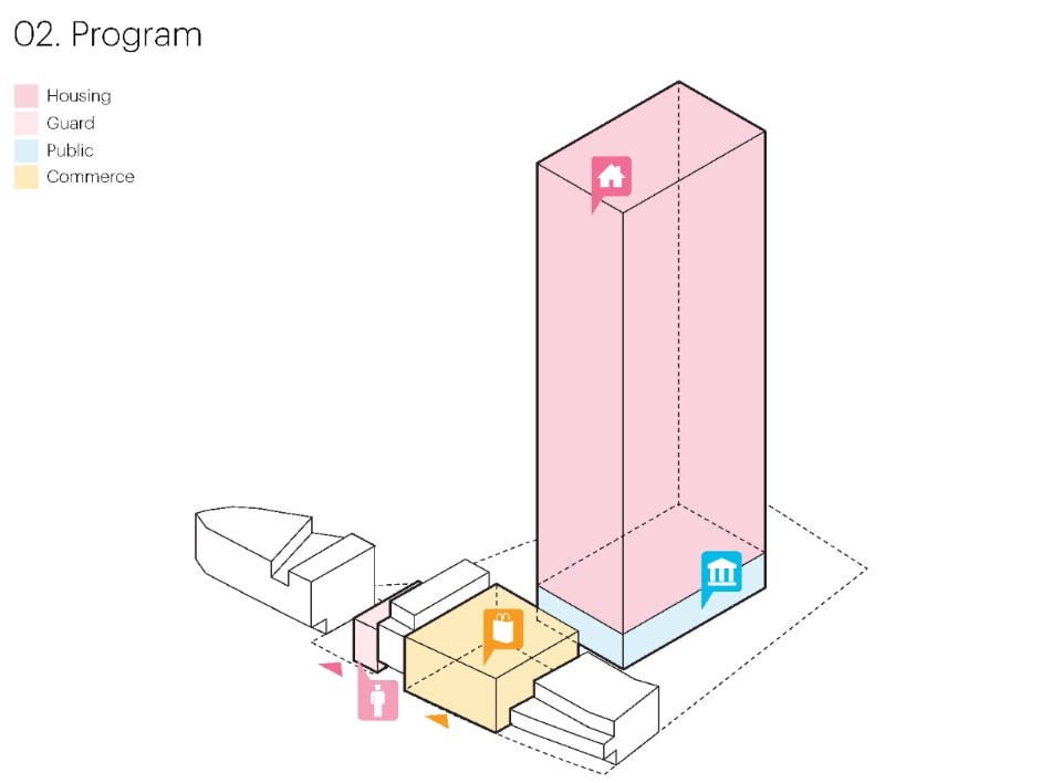 The project also includes a new commercial building along Zhongshan Road, volumetrically conforming to the surrounding buildings but formally legible as part of the new intervention, and the landscaping of open spaces.