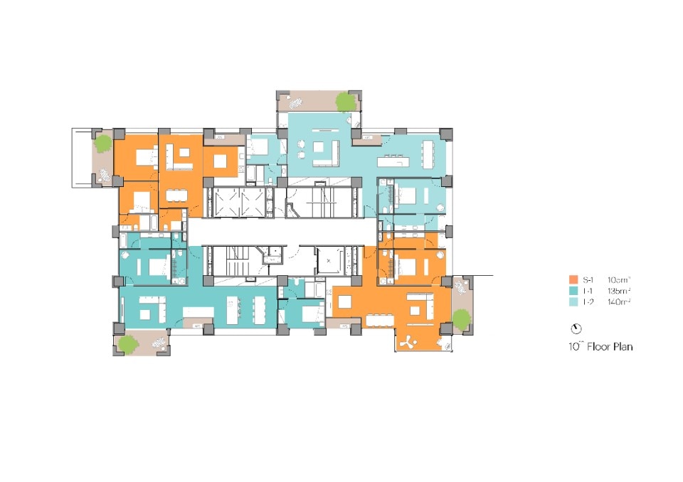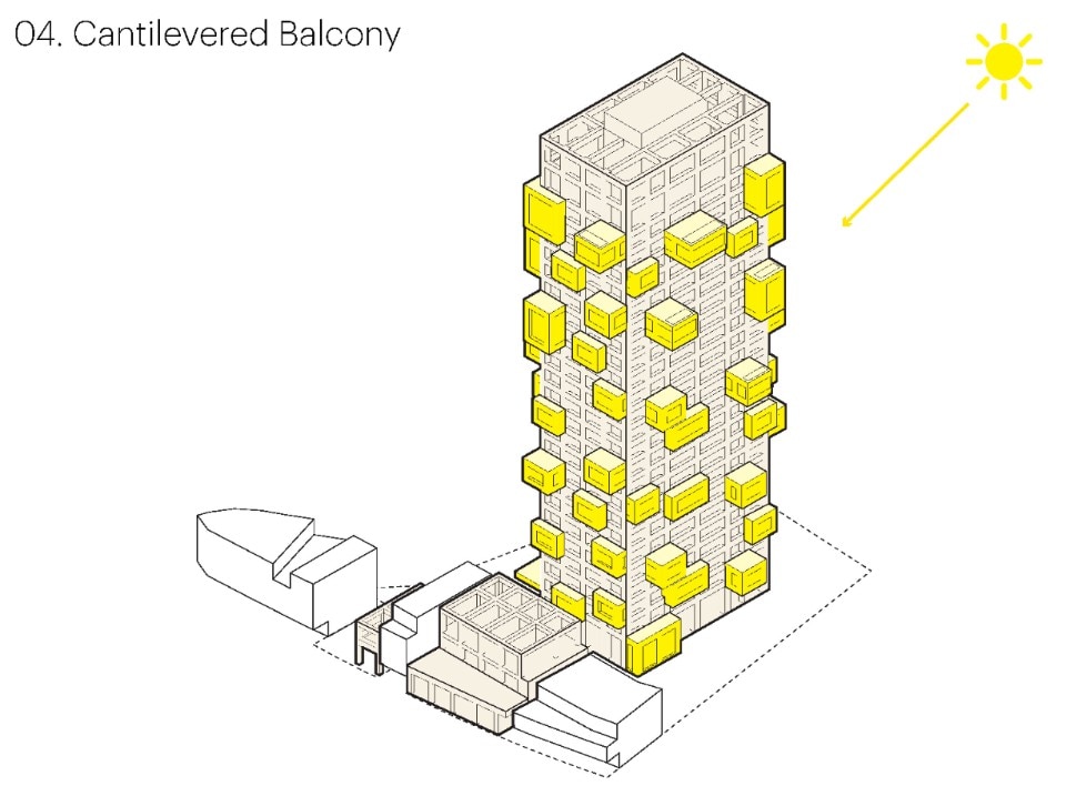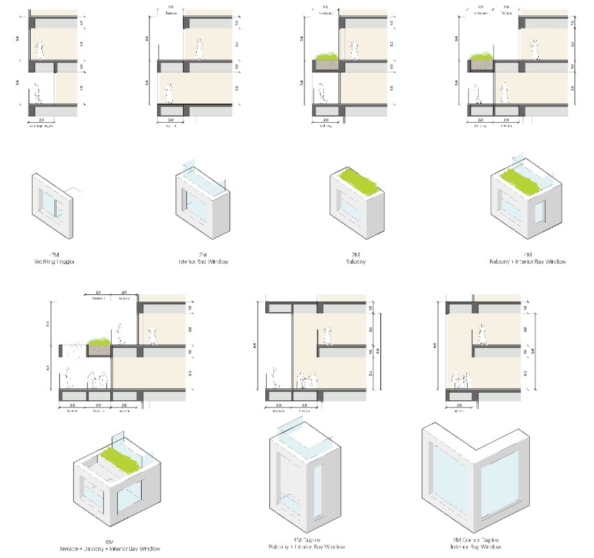 If in planimetry the 93 flats are distributed according to a reduced number of repeated typologies, the addition of the "boxes’" on the façade determines various possible configurations following a logic of maximum exploitation of the available space, enhancement of the panoramic views and internal micro-climatic comfort, thanks to the study of the orientation of the building.