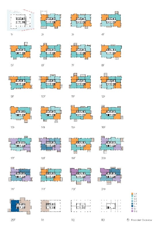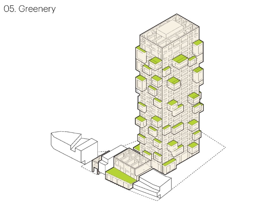 As Winy Maas, MVRDV founding partner and guest editor 2019 at Domus, states: “considering this building’s location and its low-rise neighbours, we knew that this would be a building for viewing, something to see, and something to see from. How could we express that in our design? The boxes popping out from the building signify this quality. They literally reach out into the surroundings, providing ideal lookout platforms to see the mountains and the city. From the street, they form distinctive, eye-catching features for passers-by”.