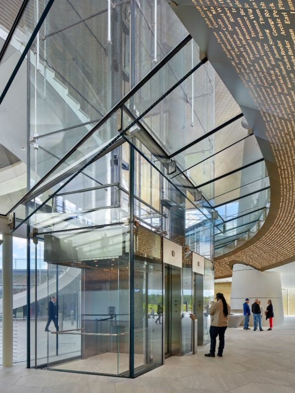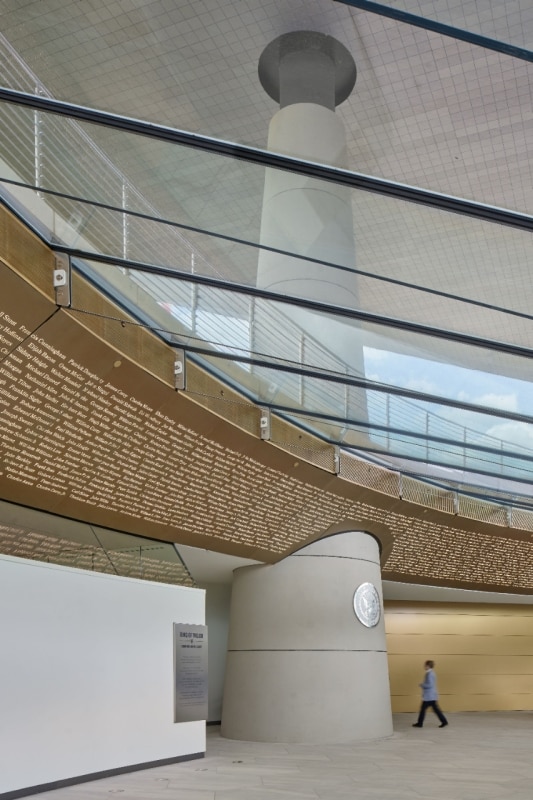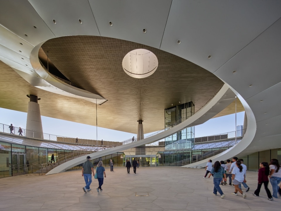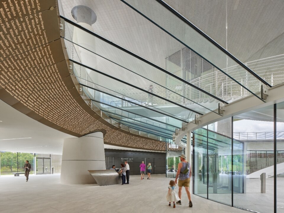 On the ground floor, a lowered circular open-air space (the “Rotunda of Honour”) accessible by the slope of the ground and enclosed by a structural glass volume - housing an education centre, a 240-seat theatre and a flex space - serves as a hub for events and ceremonies, dramatically illuminated by zenithal light penetrating through a zenithal oculus. A golden ring covers the ceiling and bears the names of the 3,528 Medal of Honour recipients, engraved and backlit to form a memorial.