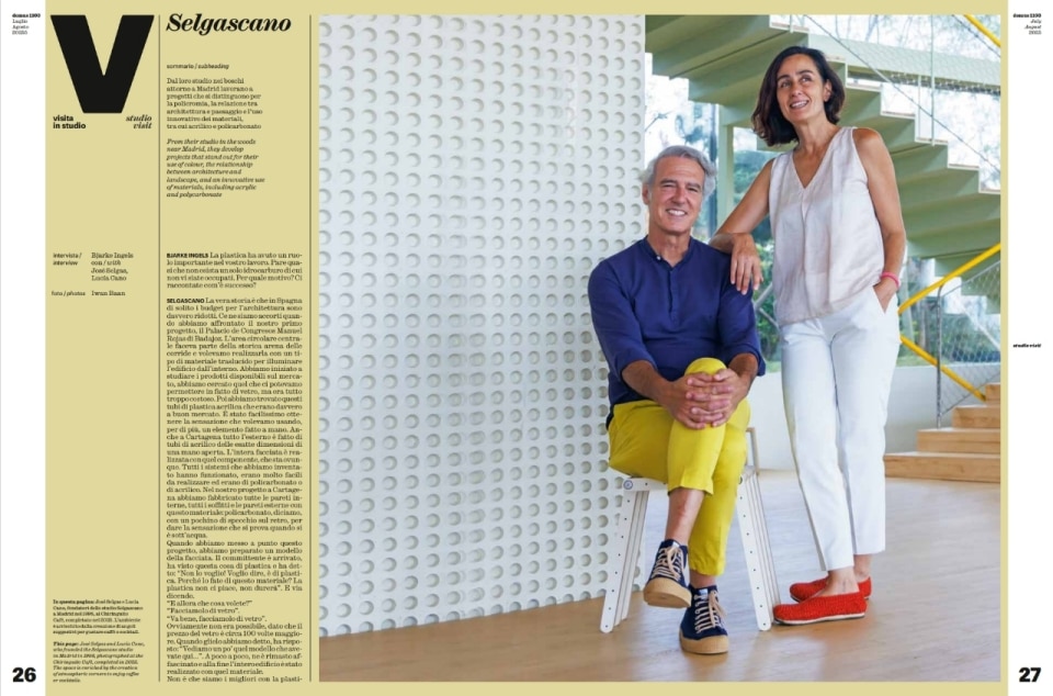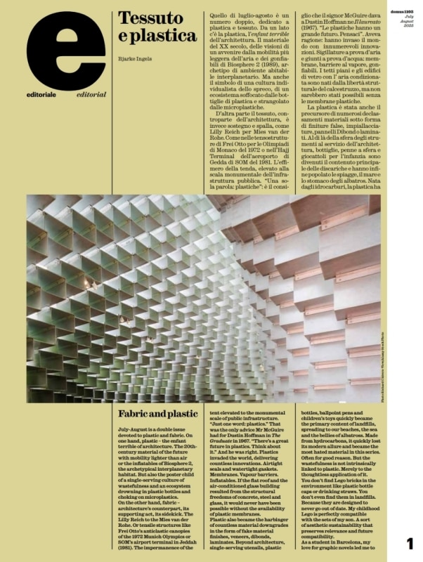 The pages of Domus are filled with visionary projects and architects who challenge the limits of what's possible. In the "Studio Visit," Bjarke Ingels converses with José Selgas and Lucía Cano of Selgascano, who reveal how their affinity for plastic, often dictated by budget, transforms into a deep exploration of tectonic and formal possibilities through the bold use of acrylic and ETFE.