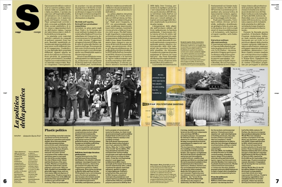 Delving into the nature of these materials, Alejandro Zaera-Polo kicks things off with an overview of "The Politics of Plastic," revealing how this material, originally developed for military purposes, permeated post-war daily life (from Tupperware to Barbie dolls). Zaera-Polo explores the paradox of a material that, while offering freedom and lightness, often succumbed to an "atetonicty" that masked its architectural potential. He also discusses the "Sick Building Syndrome" (SBS) caused by the non-breathability of plastics, while acknowledging their virtues in the "World of Greenhouses," where polycarbonate, PTFE, and ETFE have revolutionized agriculture and architecture.