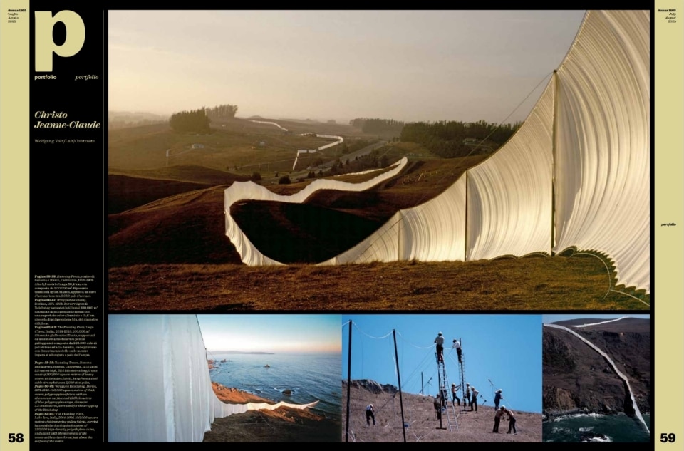 Finally, Erased Studio presents "Choreographies of Moving Fabric," a wedding reception setup that dynamically transforms the space. The "Portfolio" celebrates the textile epic of Christo and Jeanne-Claude through Wolfgang Volz's evocative photographs, immortalizing monumental works like the Running Fence, the Wrapped Reichstag, and the Floating Piers.